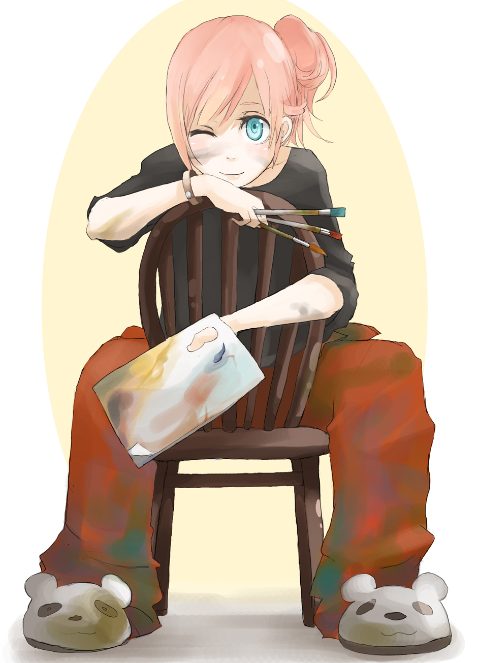 1girlart brushbaggy pantsblue eyesfemale focusone eye closedpaintpaint palettepaintbrushpantspink hairslipperssolowink