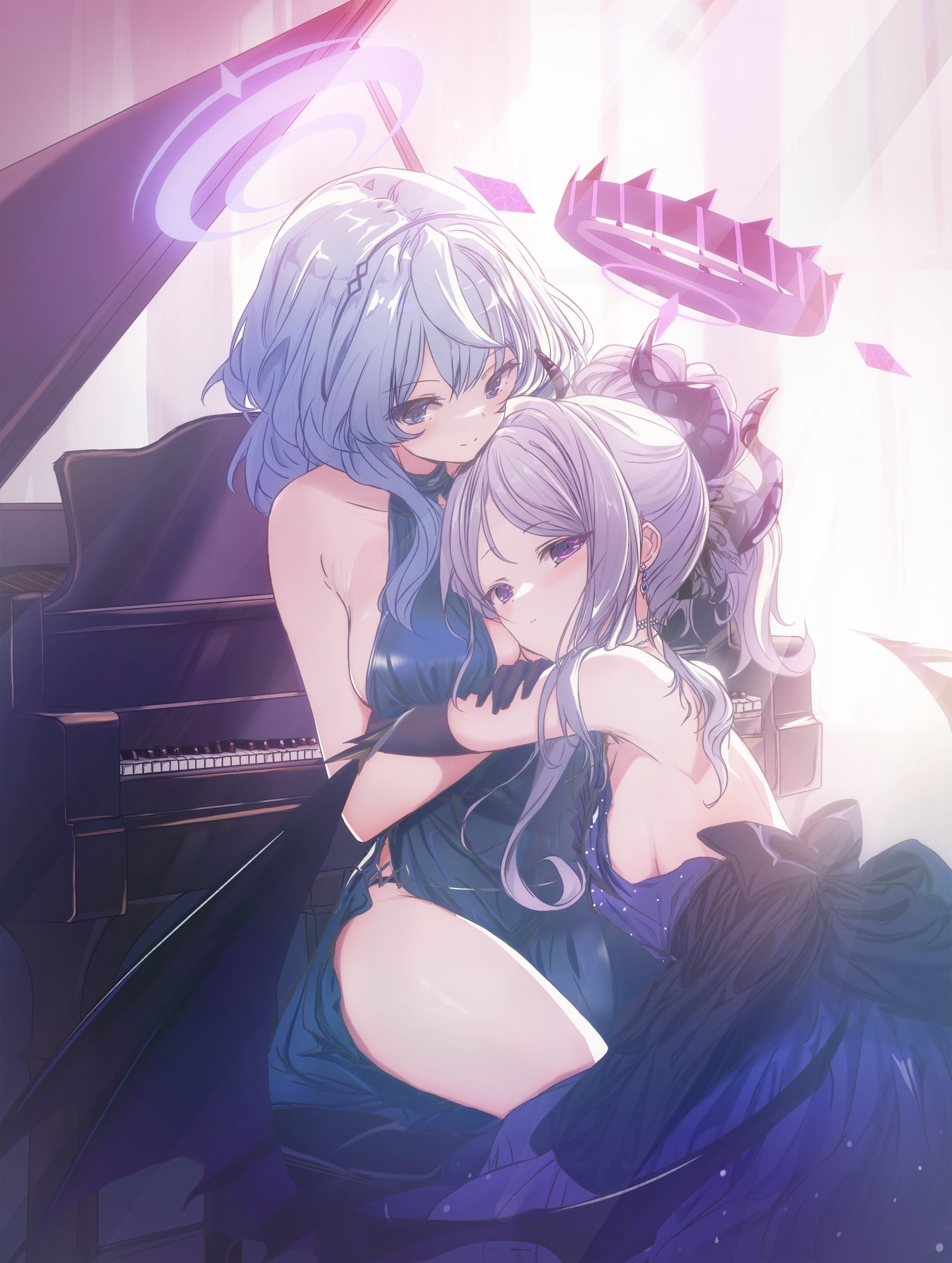 2girlsarmpit creaseback bowbackless dressbackless outfitbare shouldersblue dressblue eyesblue hairblushbowbreastsclosed eyesdemon girldemon hornsdemon wingsdressearringselbow glovesglovesgrand pianohair between eyeshair bunhalohead on chesthornshuginstrumentjewelrylarge breastslong hairlooking at anotherlooking at viewerlow wingsmultiple girlsofficial alternate costumeofficial alternate hairstylepianopurple dresspurple glovessideboobsidelockssmilestar (symbol)star printsunlightthick thighsthighswhite hairwings