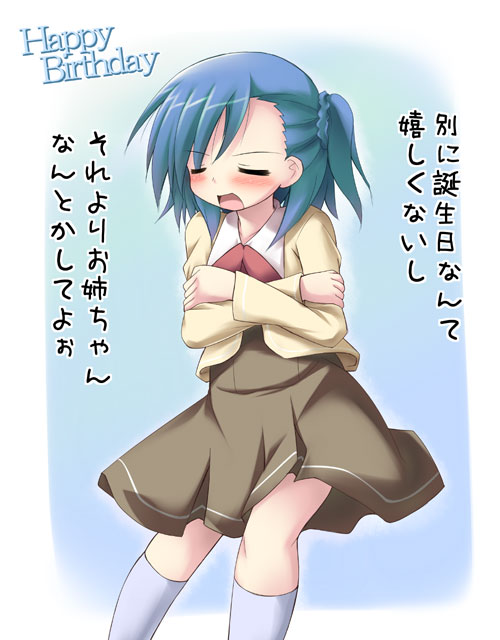 00s10s1girlbirthdayblue hairblushbowbowtieclosed eyescrossed armsfemale focusred bowred bowtieself hugsolostandingtext focusthighhighswhite thighhighswincezettai ryouiki