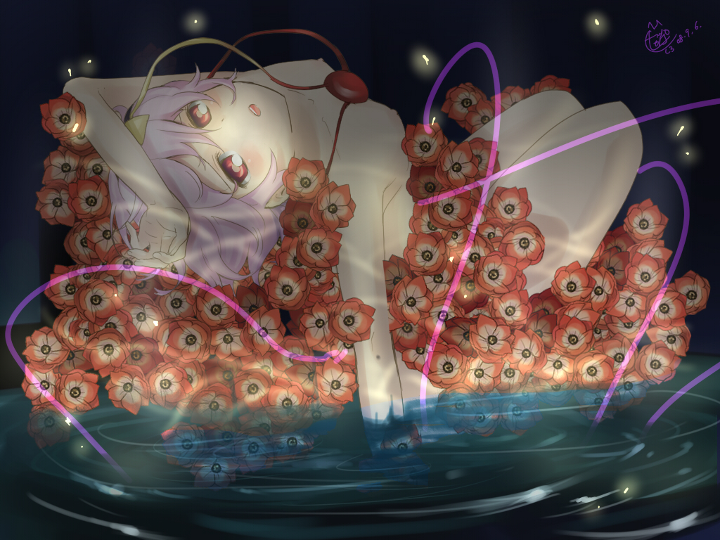 1girlblushbreastscompletely nudefemale focusflat chestflowerlooking at viewerlyingnipplesnudeon backsolowater