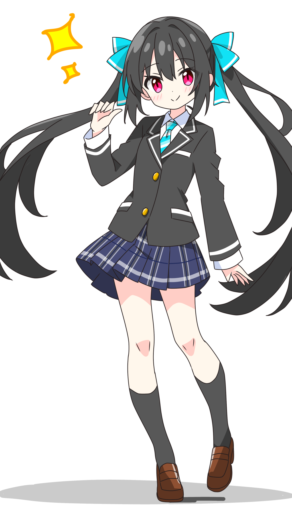 1girlblack hairblack jacketblack socksblazerblue necktieblue ribbonblue skirtblushbrown shoesclosed mouthcollared shirtdot nosefull bodyhair ribbonhand upjacketlong hairlong sleeveslooking at viewernecktiepink eyesplaid clothesplaid skirtpleated skirtribbonschool uniformshirtshoessimple backgroundskirtsmilesockssolosparklestandingstriped necktietwintailswhite backgroundwhite shirt