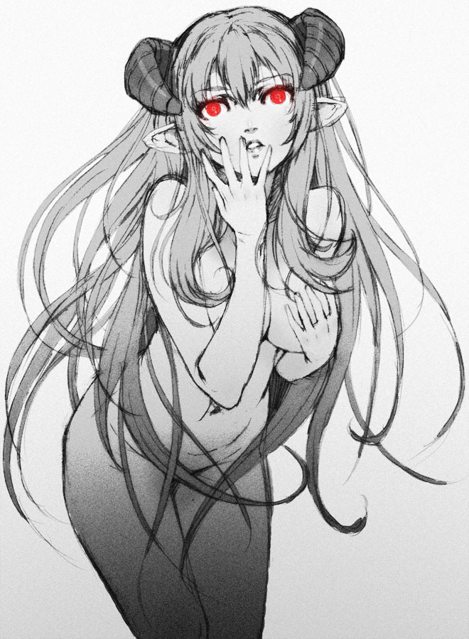 1girlbent overbreastsdemon girlfemale focusgreyscalehornslarge breastslong hairmonochromenudered eyessolospot color