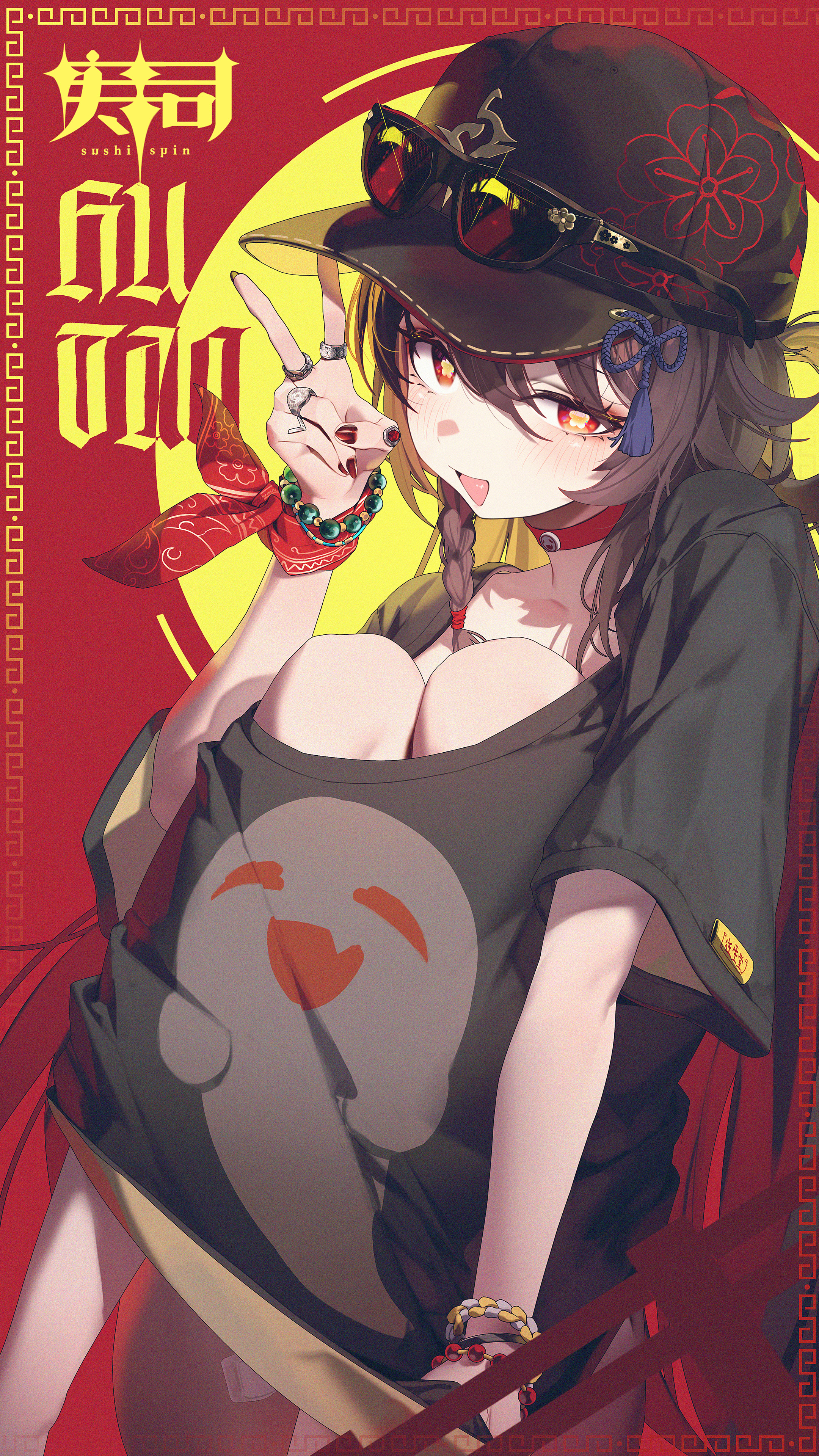 1girlalternate costumebaseball capbead braceletbeadsblack hatblack shirtblushbraceletbrown hairchokerenglish texteyewear on headwearflower-shaped pupilshatjewelryknee upmultiple ringsopen mouthred backgroundred chokerred eyesred nailsringshirtsolosunglassessymbol-shaped pupilsv
