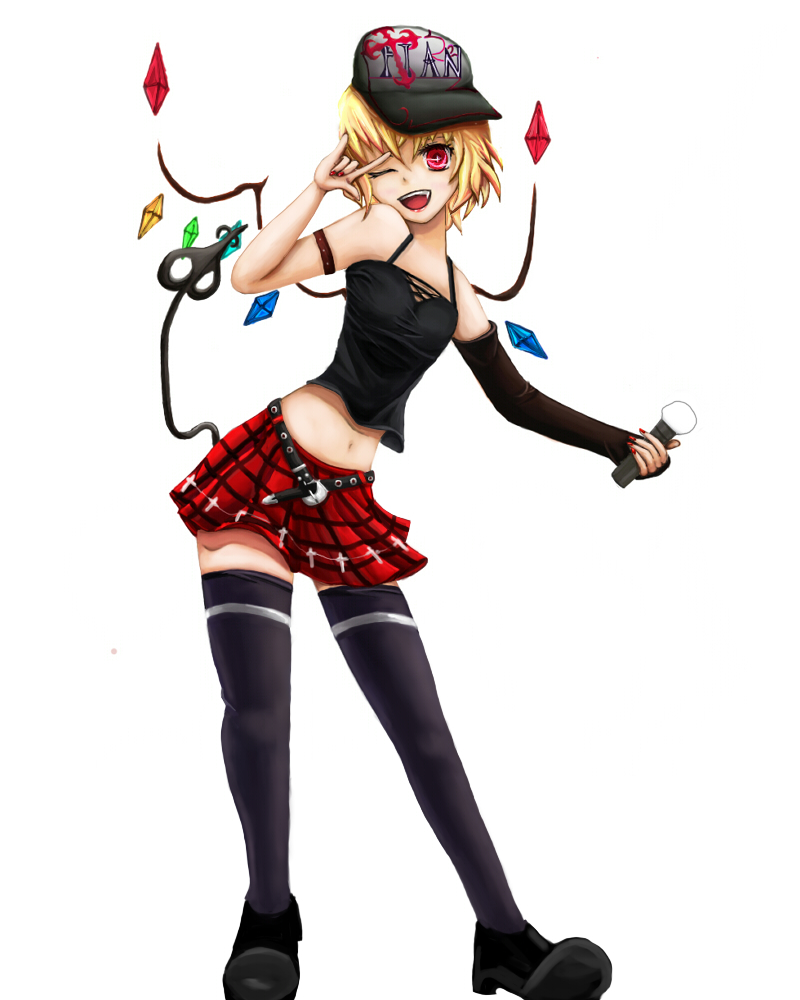 1girlalternate costumeblonde hairfemale focushatminiskirtnavelone eye closedred eyesribbonshort hairskirtsockssolothighhighswhite backgroundwingswinkzettai ryouiki