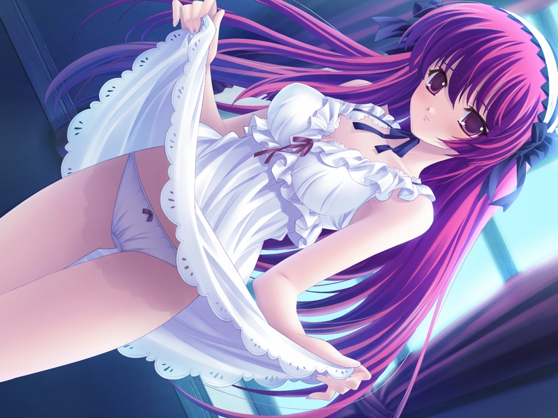 1girlclothes liftdressdress liftdutch anglefemale focusfrillslong hairpantiespurple eyesred hairsolounderwear