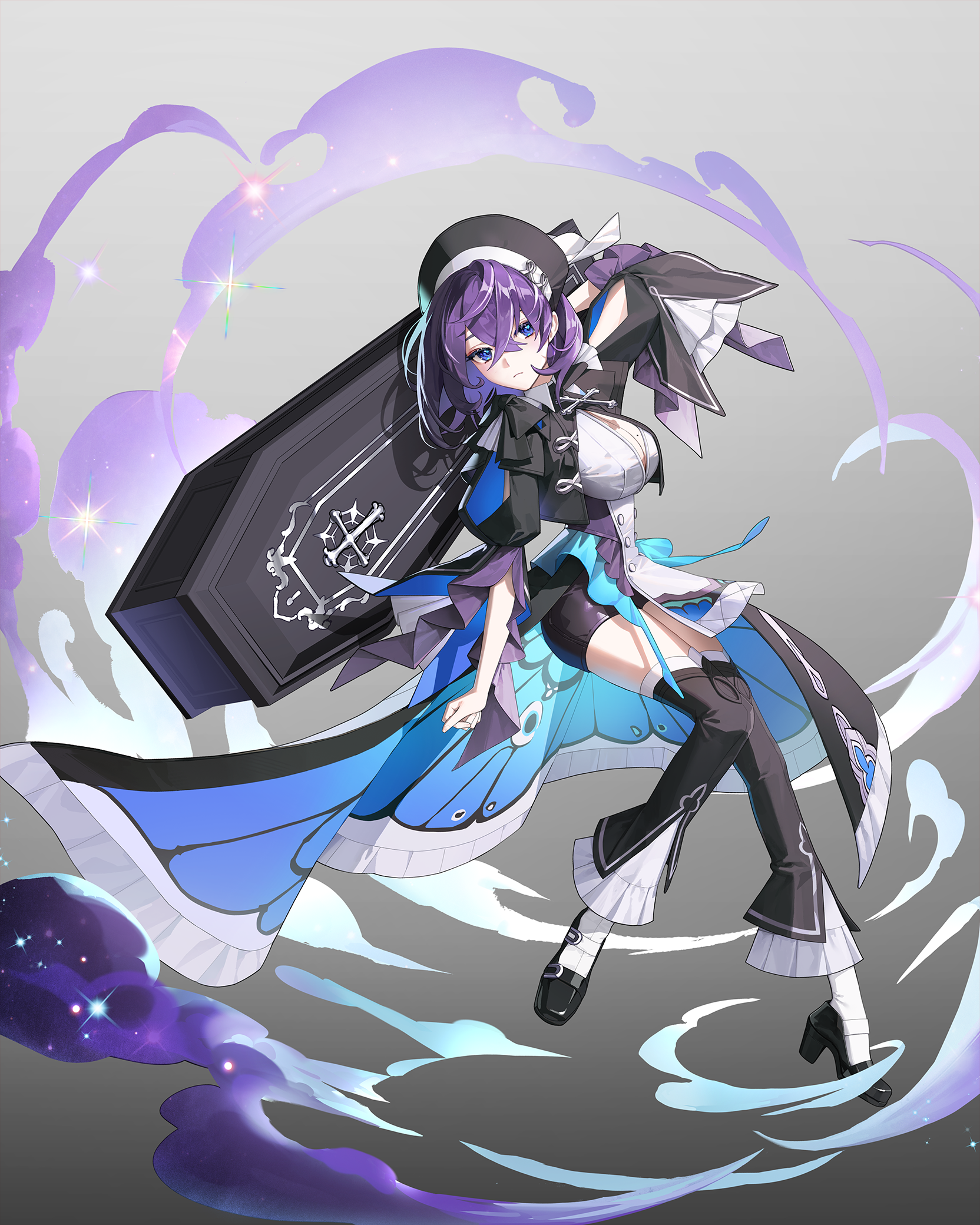 1girlblack hatblack shoesblack shortsblack thighhighsblue eyesbreastscleavageclosed mouthcoffincropped jacketcrossed bangsfull bodygrey backgroundhair between eyeshathigh heelsjacketlarge breastslong hairlong sleevesmolemole on breastopen clothesopen jacketoutstretched armpurple hairshirtshoesshortssolothighhighswhite shirt