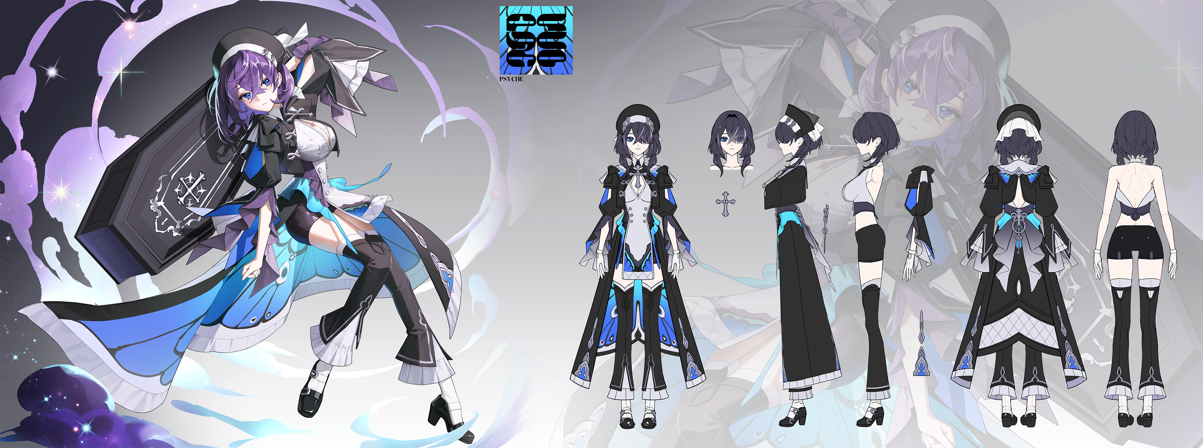1girlblack hatblack shoesblack shortsblack thighhighsblue eyesbreastscleavageclosed mouthcoffincropped jacketcrossed bangsfull bodygrey backgroundhair between eyeshathigh heelsjacketlarge breastslong hairlong sleevesmolemole on breastmultiple viewsopen clothesopen jacketoutstretched armpurple hairreference sheetshirtshoesshortsthighhighswhite shirt