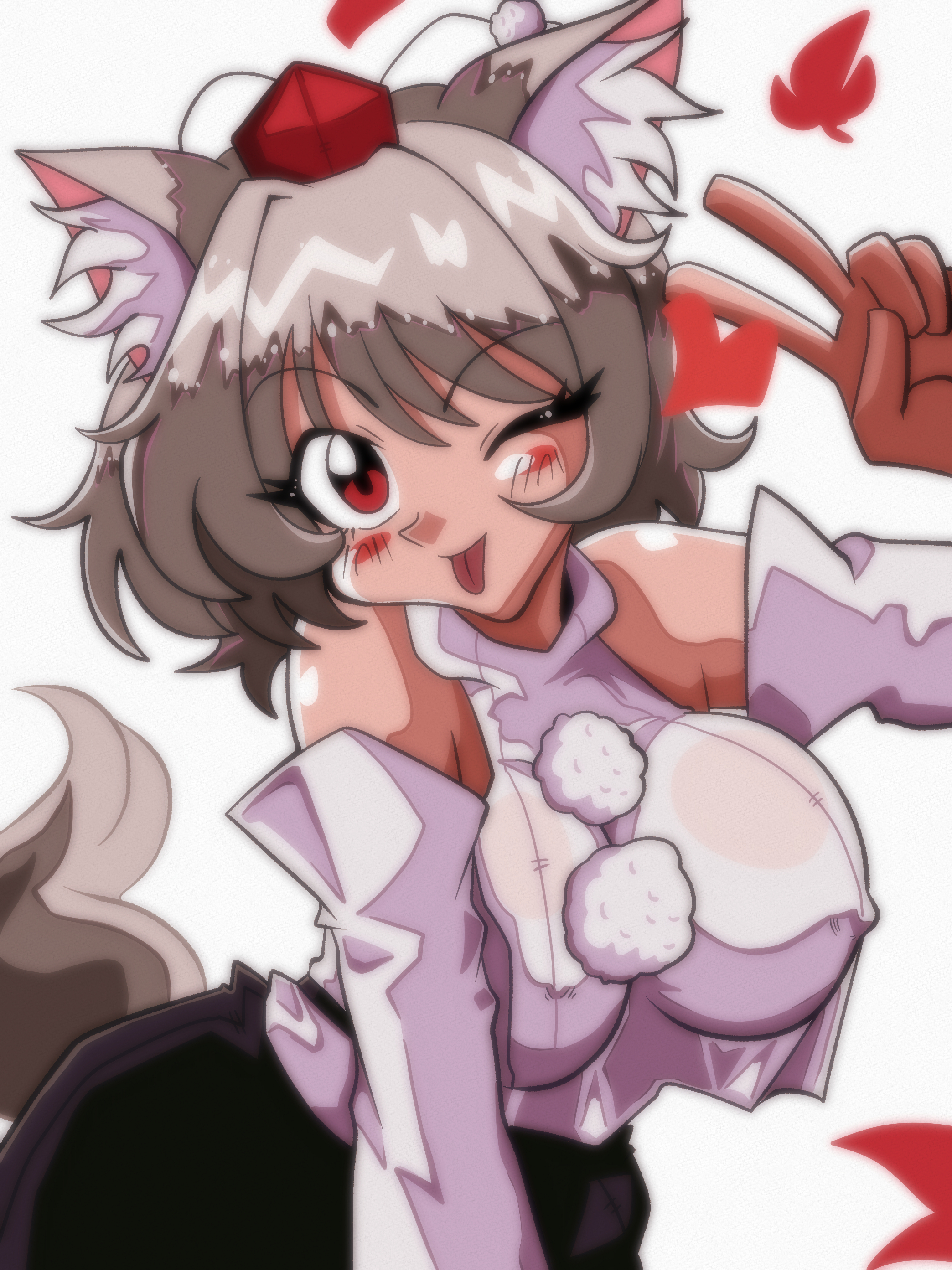 1990s (style)1girlanimal ear fluffanimal earsarm upblack skirtbloomblushbreastsdetached sleevesfalling leavesgrey hairhatlarge breastsleafleaning forwardlong sleevesmaple leafone eye closedopen mouthpom pom (clothes)red eyesred hatretro artstyleshirtshort hairsimple backgroundskirtsmilesoloswept bangstailtokin hatupper bodyvwhite backgroundwhite shirtwolf earswolf girlwolf tail