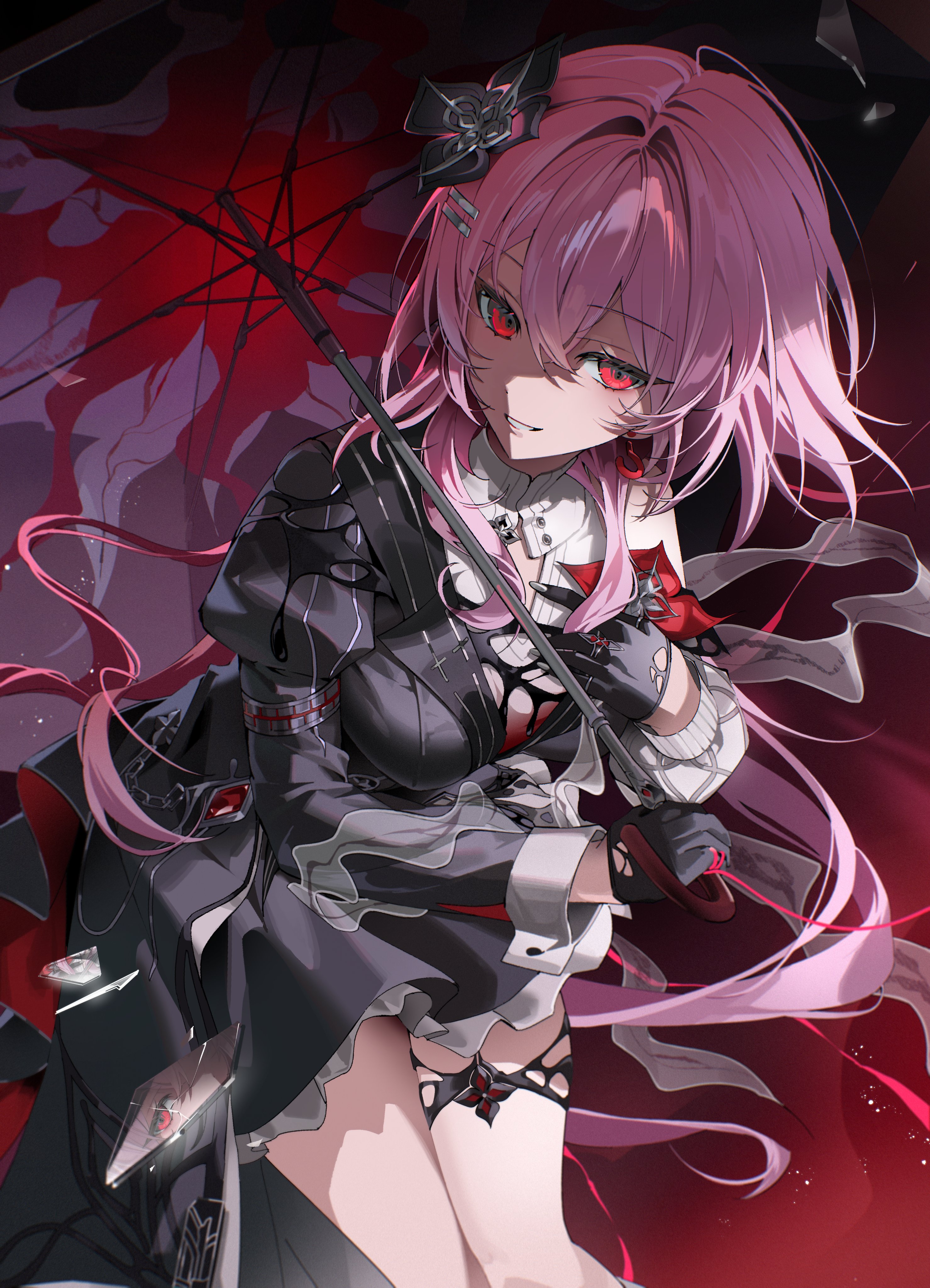 1girlblack backgroundblack dressblack glovesblack umbrellabreastsdressflowergloveshair flowerhair ornamentholdingholding umbrellaleaning forwardlong hairlooking at viewermedium breastsparted lipspink hairred eyesshirtsoloumbrellaumbrella over shoulderwhite shirt