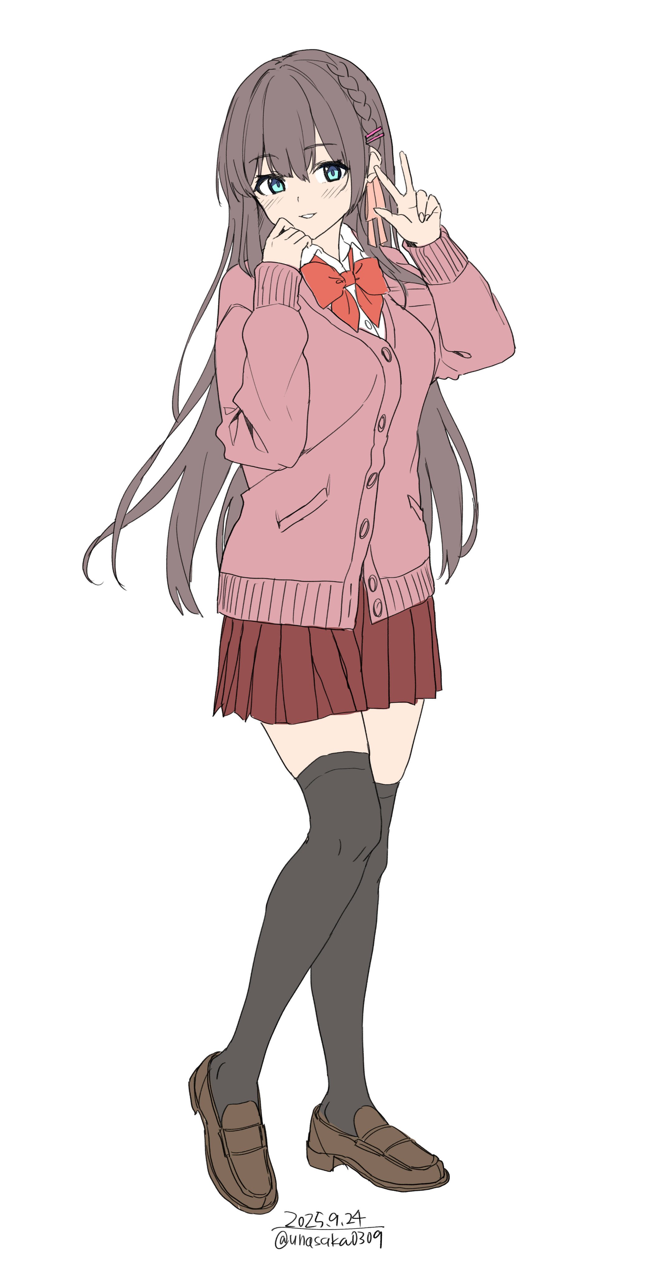 1girlblack thighhighsblue eyesbraidbreastsbrown haircardigancollared shirthair ornamenthair ribbonlong hairlong sleeveslooking at viewerparted lipspink cardiganpleated skirtred skirtribbonschool uniformshirtshoessimple backgroundskirtsmilesolothighhighswwhite backgroundwhite shirtzettai ryouiki