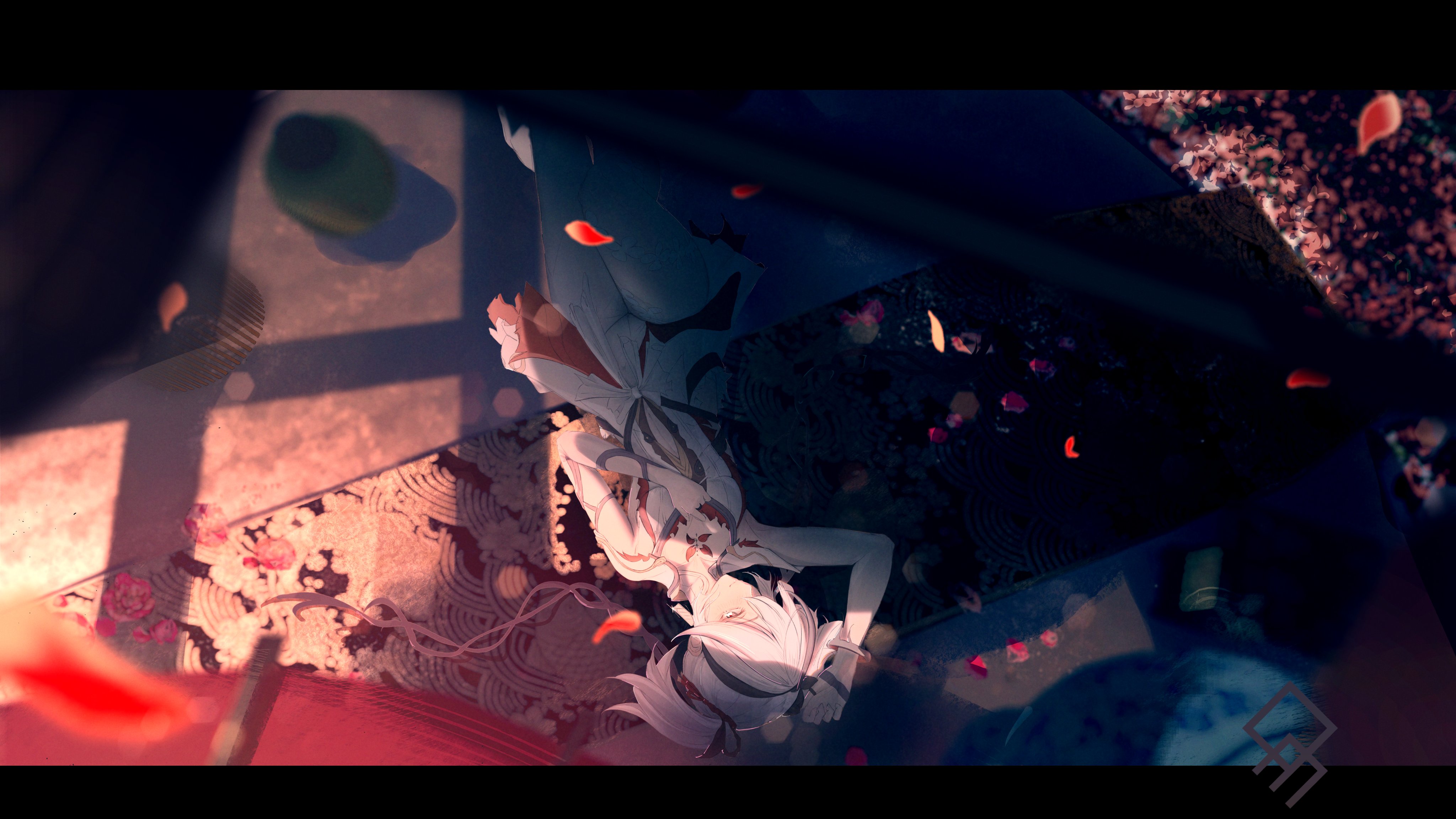 1girlarm upartist logobreastsdressfrom abovehair ribbonhand on own chestletterboxedlogolooking at viewerlyingon backpantyhosered petalsred ribbonribbonsmall breastssolowhite dresswhite hairwhite pantyhose