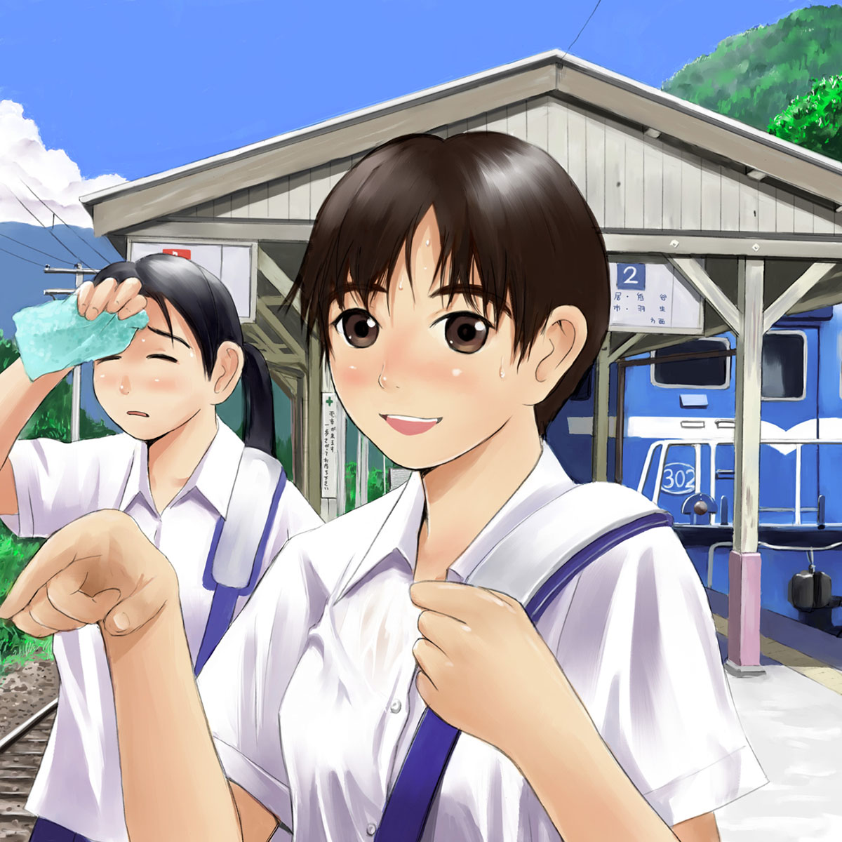 kodai susumu, mori yuki, uchuu senkan yamato, uchuu senkan yamato 2199, uchuu senkan yamato 2202: ai no senshi-tachi, animated, animated gif, anime screenshot, lowres, tagme, 10s, 1boy, 1girl, 2018, aircraft, airship, ass, blonde hair, bodysuit, breasts, brown eyes, brown hair, climbing ladder, from behind, hair between eyes, huge ass, long hair, medium breasts, military, military uniform, science fiction, short hair, skin tight, smile, spaceship, wide hips
