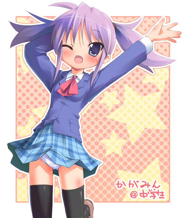 1girlblazerblushbowcosplayfemale focusjacketminiskirtone eye closedpantiespantyshotpink bowplaid clothesplaid skirtpurple eyespurple hairschool uniformskirtsolothighhighstwintailsunderwearupskirtwinkzettai ryouiki