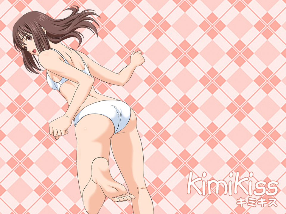 1girlassbarefootbikinibrown eyesbrown hairclenched handsfeetfemale focusfrom behindlooking backopen mouthplaid backgroundsolessoloswimsuittoeswhite bikini