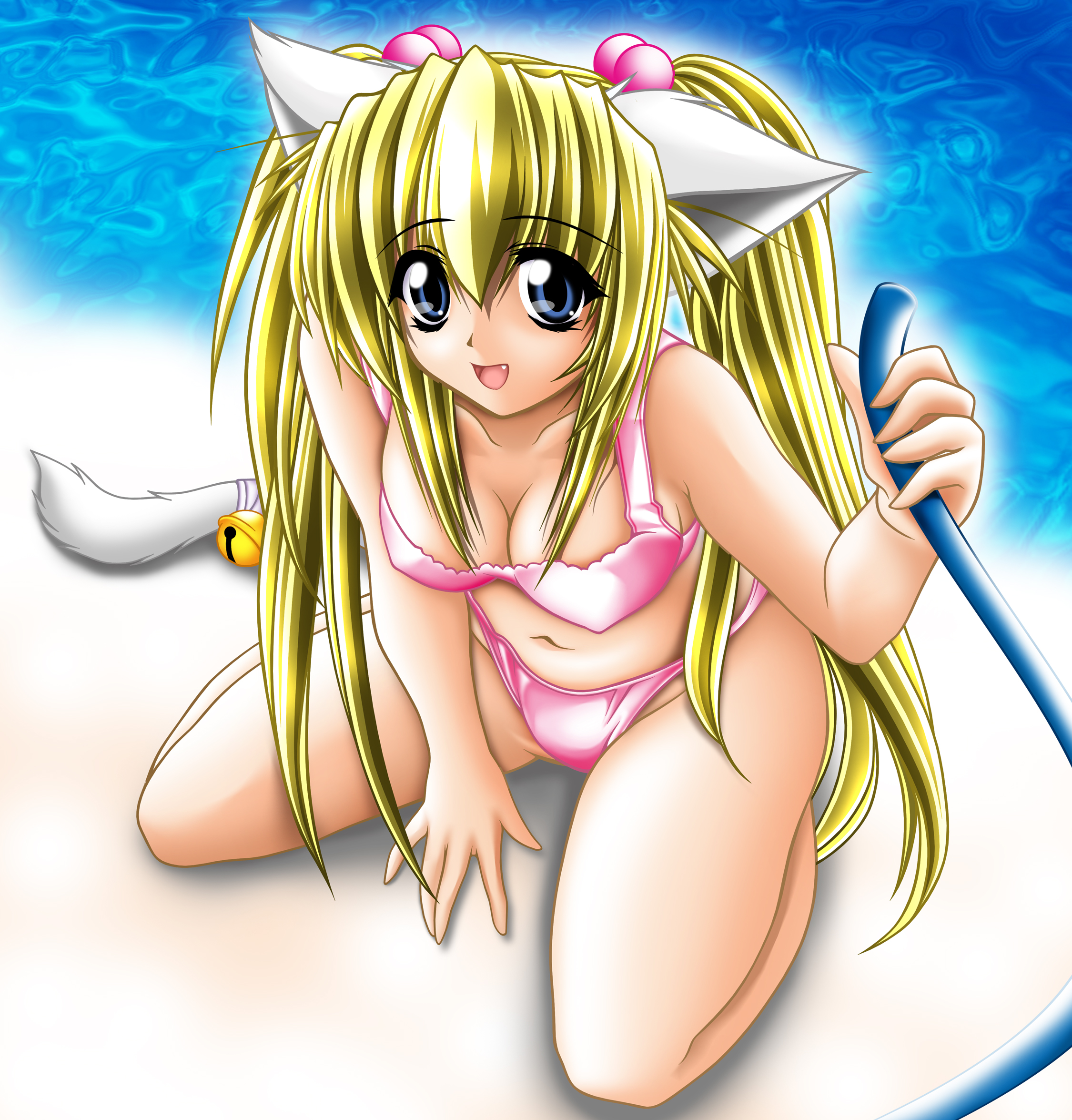 1girlanimal earsbeachbellbikiniblonde hairblue eyesblushbreastscat earscat tailcleavagefangfemale focuslarge breastslong hairpink bikinisoloswimsuittailtwintails