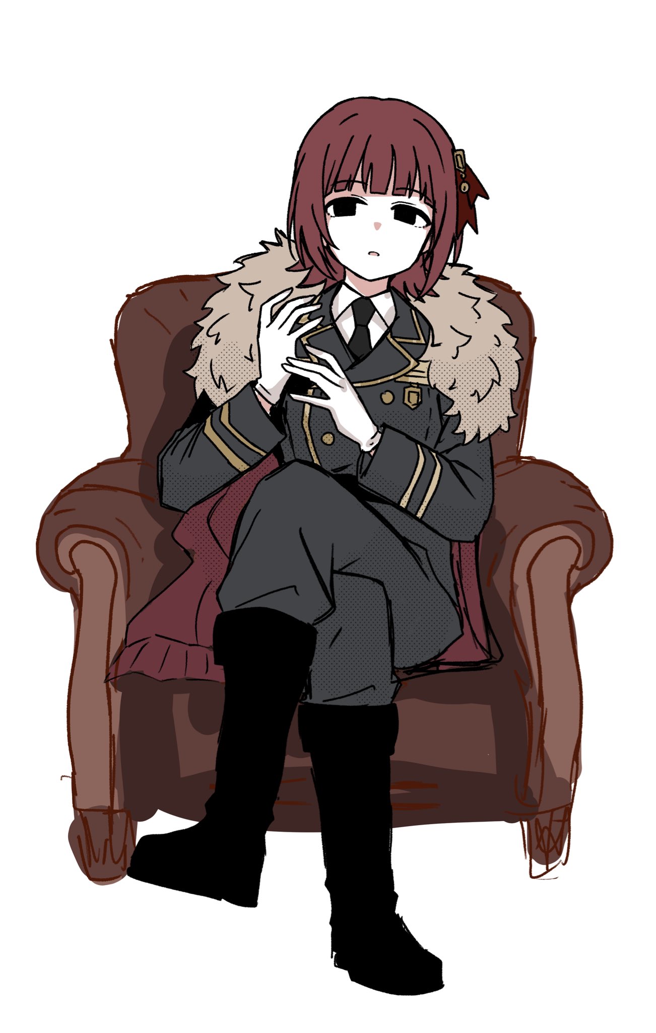 1girlarmchairblack bootsbootsbrown hairchaircrossed legsglovesgrey jacketgrey pantsjacketknee bootslong sleeveslooking at viewermilitary dress uniformmilitary uniformon chairpantsshort hairsimple backgroundsittingsolowhite backgroundwhite gloves