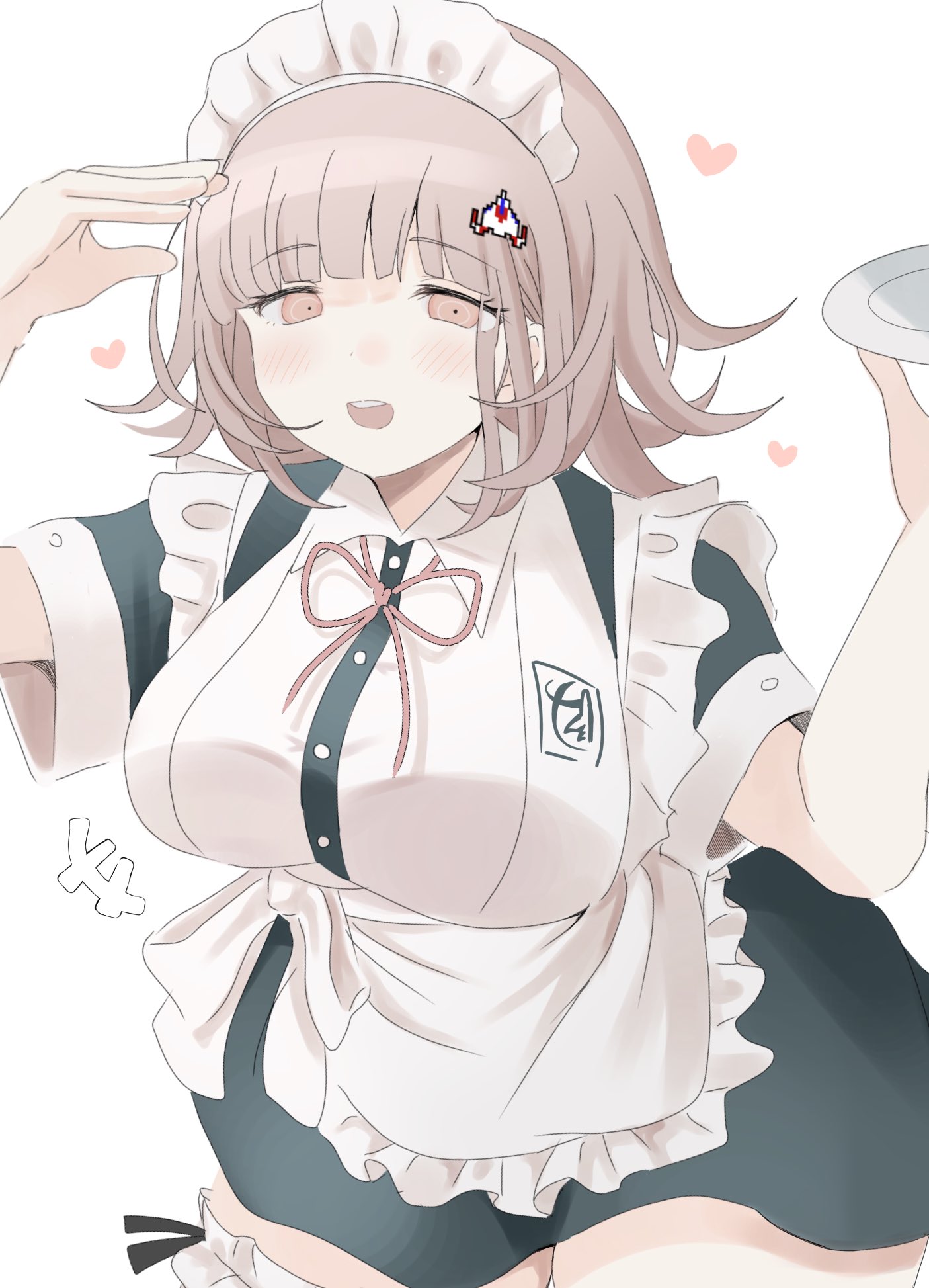 1girlapronblack dressbreastsbrown hairdressflipped hairfrillshair ornamentmaidmaid apronmaid headdressmedium hairneck ribbonopen mouthpink ribbonpuffy short sleevespuffy sleevesribbonshort sleevessimple backgroundsmilesolo