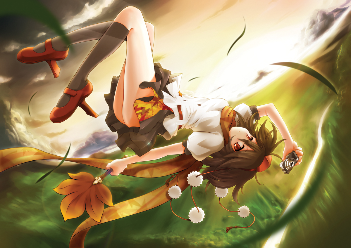 1girlblack hairblack sockscamerafemale focusflyinggetahatkneehighsleaflooking at viewerno pantiesribbonscarfshort hairskirtsockssolotengu-getaupside-down