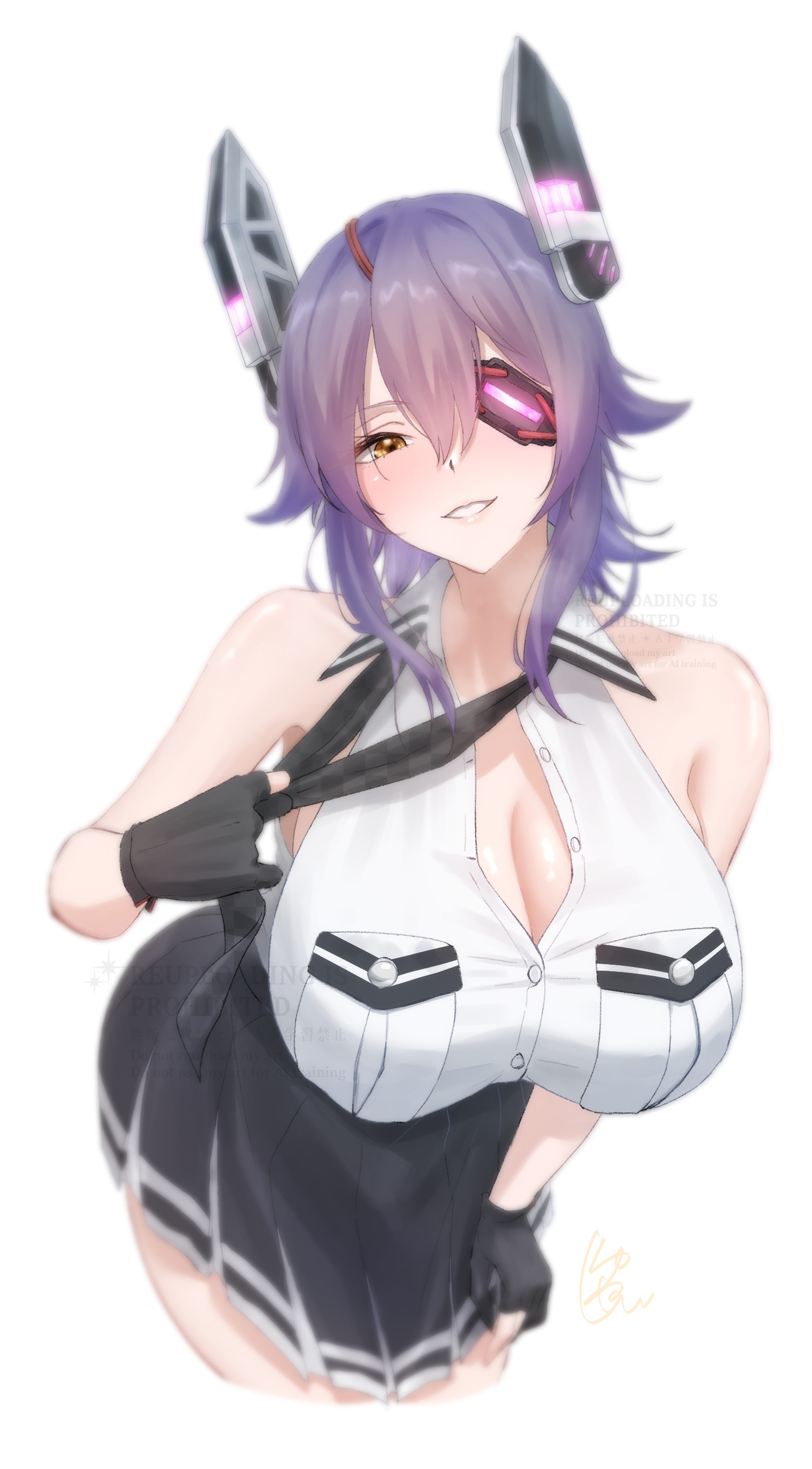 1girlblack glovesblack skirtblushbreast pocketbreastscheckered necktiecleavageclothes grabcowboy shoteyepatchfeet out of frameglovesheadgearheavy breathinglarge breastslooking at viewernecktienecktie grabneckwear grabopen clothesopen mouthopen shirtpartially fingerless glovespartially unbuttonedpocketpurple hairshirtshort hairsimple backgroundskirtsleevelesssleeveless shirtsolowhite backgroundwhite shirtyellow eyes