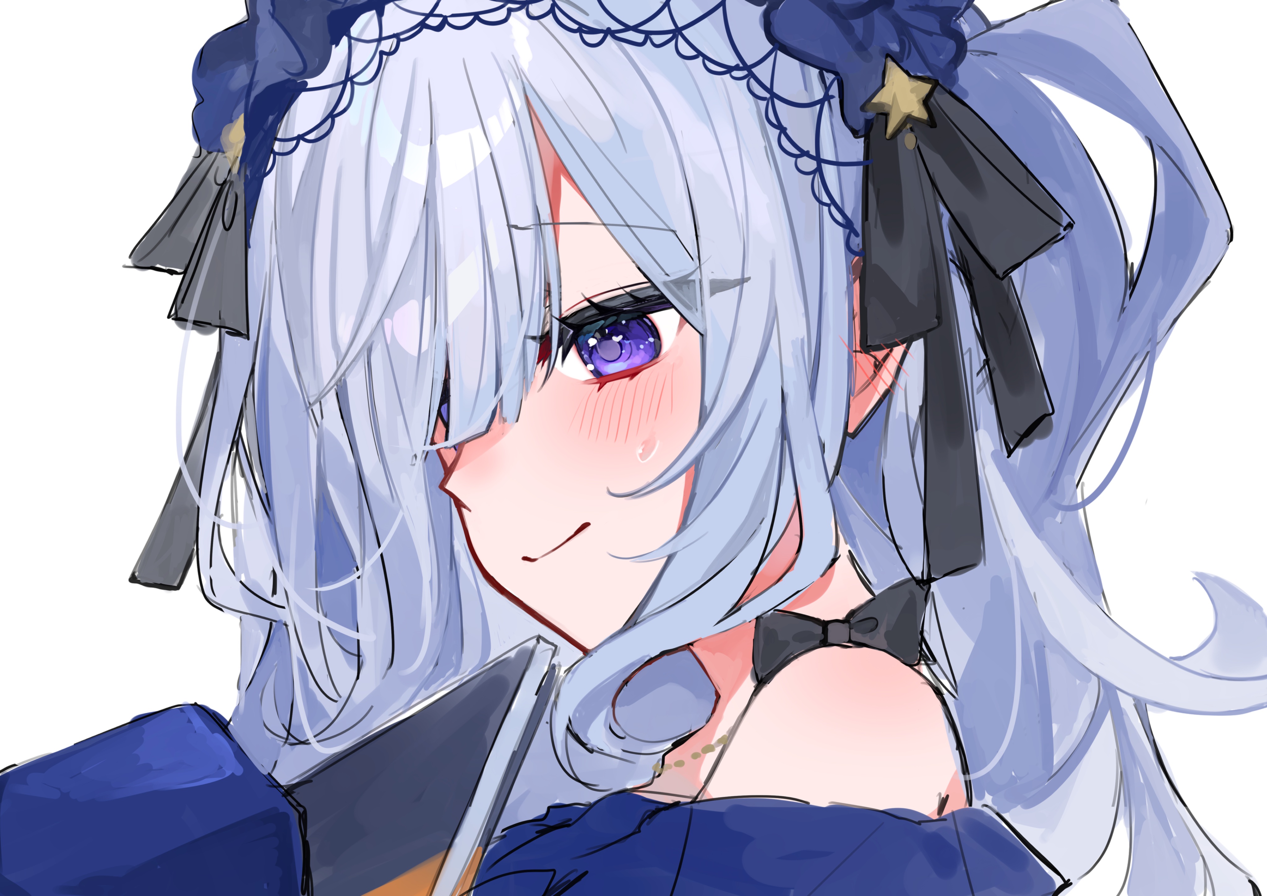 rishac owo, nakatsu shizuru, rewrite, absurdres, commentary request, commission, highres, 1girl, anime coloring, blonde hair, blue background, blue eyes, blush, d:, dress, eyepatch, from behind, hair between eyes, kazamatsuri institute high school uniform, long hair, looking at viewer, looking back, medical eyepatch, one eye covered, open mouth, pink dress, school uniform, sidelocks, simple background, solo, twintails, twintails with hair base, upper body