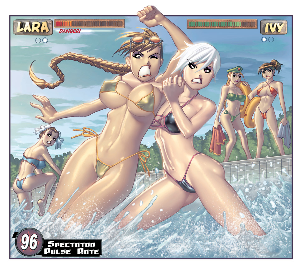 peter chai, angela (marvel), daredevil, marvel, marvel rivals, thor (marvel) (series), absurdres, highres, 1boy, 1girl, armor, ass, breasts, holding, long hair, metal bra, muscular, muscular female, red hair, simple background
