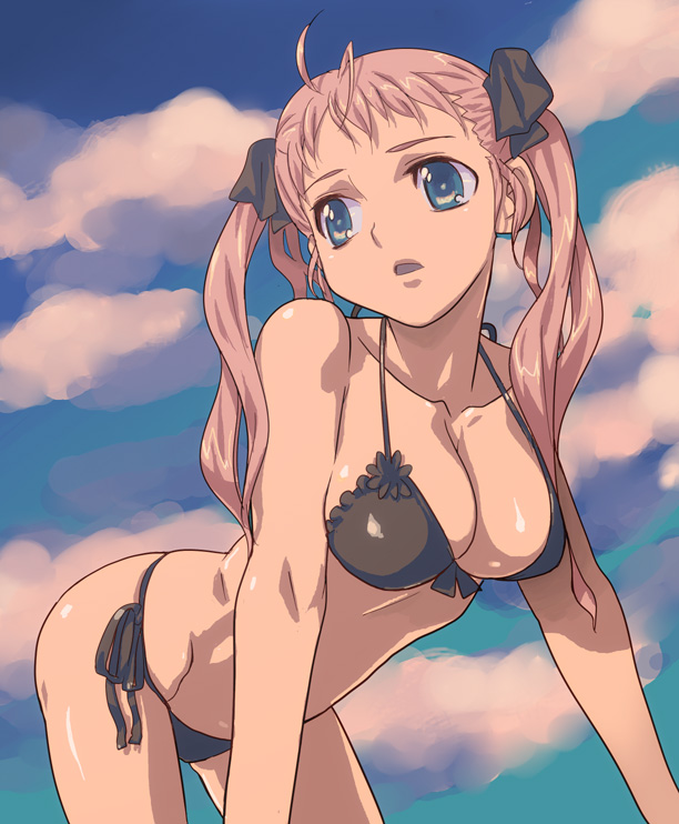 1girlall foursbikiniblack bikiniblue eyesbreastscleavagefemale focushalternecklarge breastspink hairside-tie bikini bottomsoloswimsuittwintails