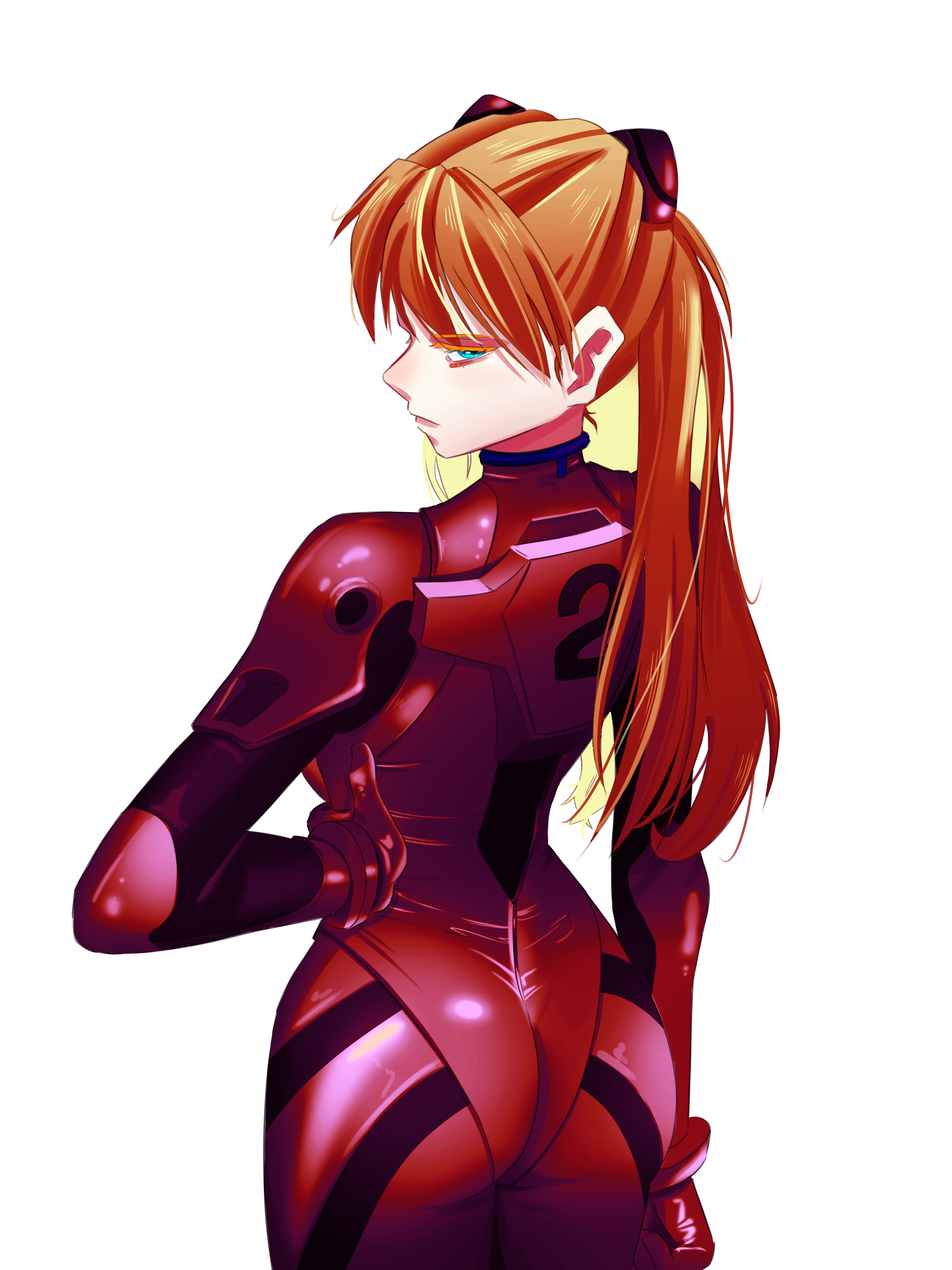 1girlassblue eyesbodysuitbreastscurvyexpressionlessfrom behindhand on own hiphuge asslong hairlooking at viewerlooking backmecha pilot suitorange hairplugsuit (evangelion)shiny clothessimple backgroundskin tightsolostandingwhite backgroundwide hips
