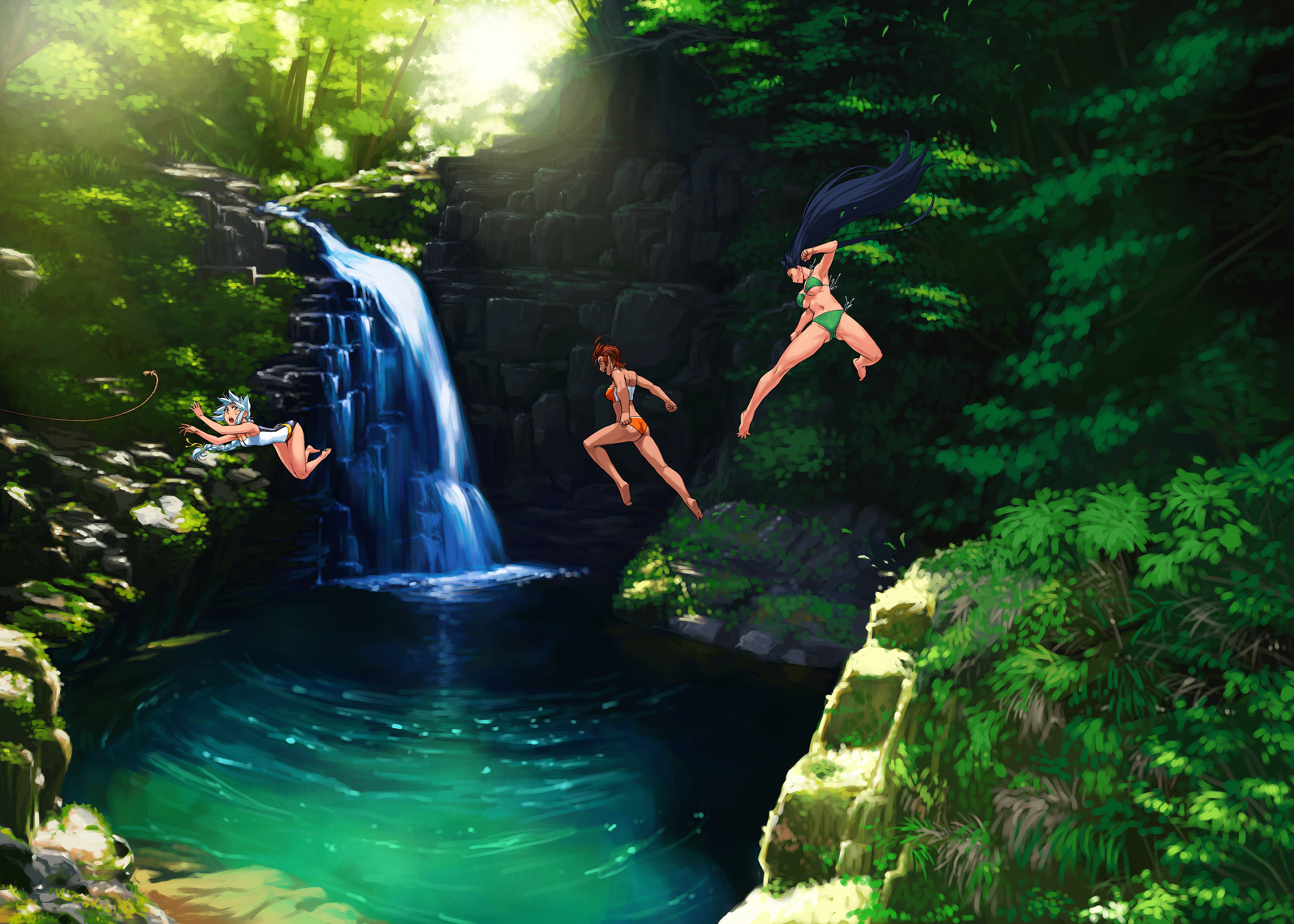 3girlsanimal earsbarefootbikiniblue hairbreastscat earscleavagedaydivefallingfeetjumpinglarge breastslong hairmultiple girlsnatureone-piece swimsuitoutdoorsred hairsceneryshort hairside-tie bikini bottomstring bikiniswimsuitunderboobwaterwaterfallwhite hair
