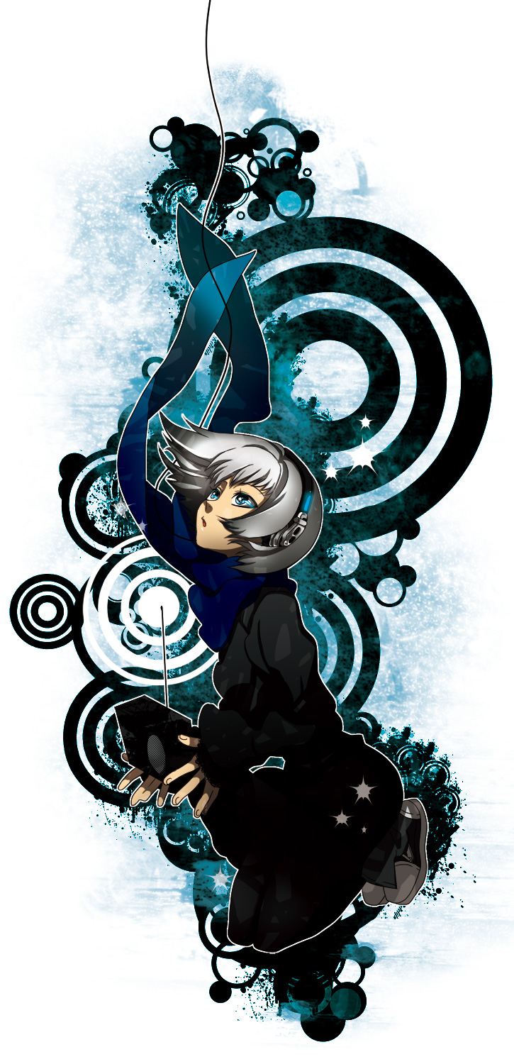 myam (123ab456c), adashino adami, mr. scarletella, homicipher, commentary request, highres, translation request, 1girl, 2boys, alternate color, black hair, blue coat, blue eyes, blue hair, blue nails, blue umbrella, blush, coat, crowbar, dilated pupils, grey background, hair over one eye, hetero, holding, holding crowbar, holding umbrella, multiple boys, player 2, short hair, simple background, umbrella