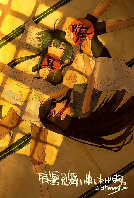 hitoniarazu, ibuki suika, touhou, > <, 1girl, chain, closed eyes, female focus, full body, horns, orange hair, ribbon, running, solo, white background