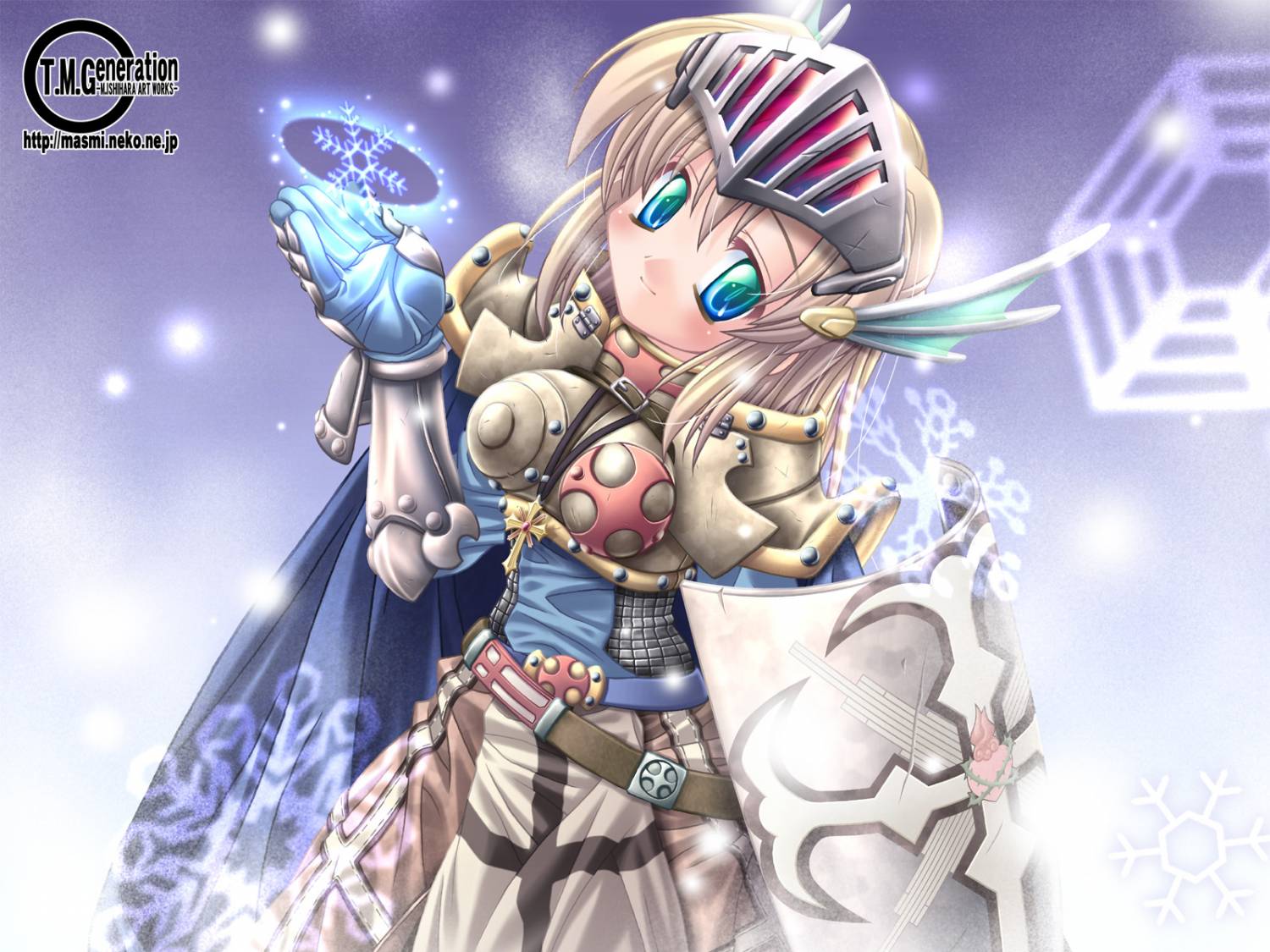 1girlarmorblonde hairblue eyesbreastplatecapefemale focusgauntletsgradient eyesgreen eyesmulticolored eyesshieldshort hairsmilesnowsolovisor (armor)