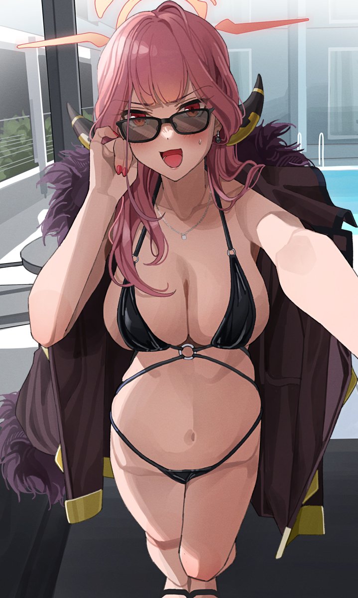 sakiyamama, original, highres, 1girl, bikini, blush, bracelet, breasts, cleavage, collarbone, earrings, flower, green eyes, hair flower, hair ornament, jewelry, large breasts, looking at viewer, mole, mole under eye, navel, necklace, parted lips, pink bikini, pink hair, solo, swimsuit