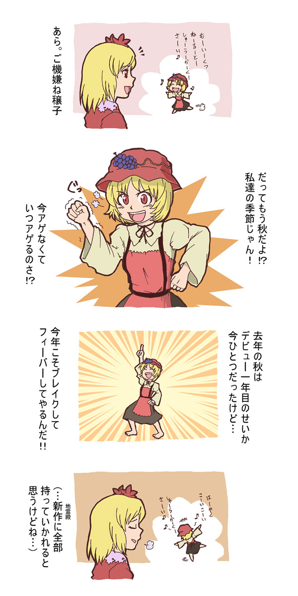 2girlsbarefootblonde hairclenched handdancingemphasis linesexcitedfemale focusflowerfoodfruitgrapeshair flowerhair ornamenthand on own hiphatlyricsmultiple girlspointingpointing upred eyessiblingssighsistersskirt