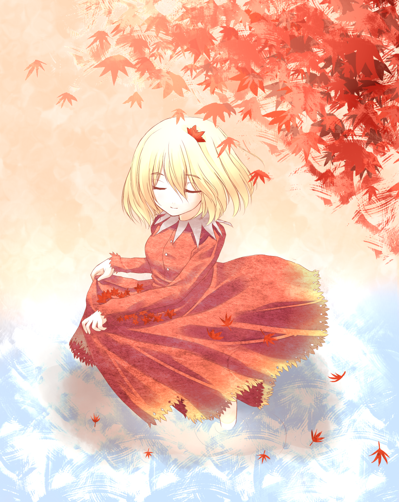 1girlautumnblonde hairclosed eyesdancingdressfemale focusfrom abovehair ornamentleafleaf hair ornamentred dressshort hairskirt holdsolowadingwater