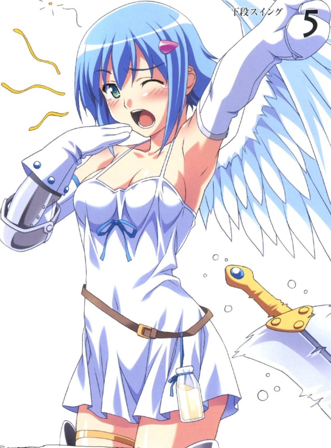 00sangelangel wingsarmpitsarms upasymmetrical wingsbare shouldersblue hairblushbootselbow glovesglovesgreen eyesminiskirtpantiesshort hairskirtsoloswordtearsthighhighsunderwearweaponwingsyawning