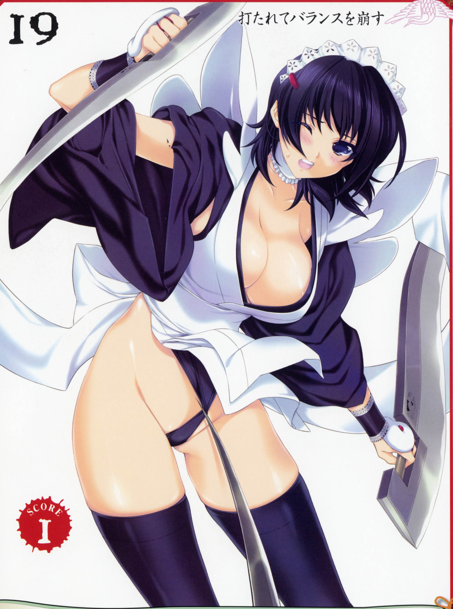 00s1girlblack hairblue eyesblushbreastsbutterfly swordschokercleavagefemale focushair ornamentholdingholding weaponlarge breastsleotardleotard under clotheslooking at anotherlooking at viewermoaningopen mouthshiny skinshort hairsoloswordthighhighsweaponwide hipswince