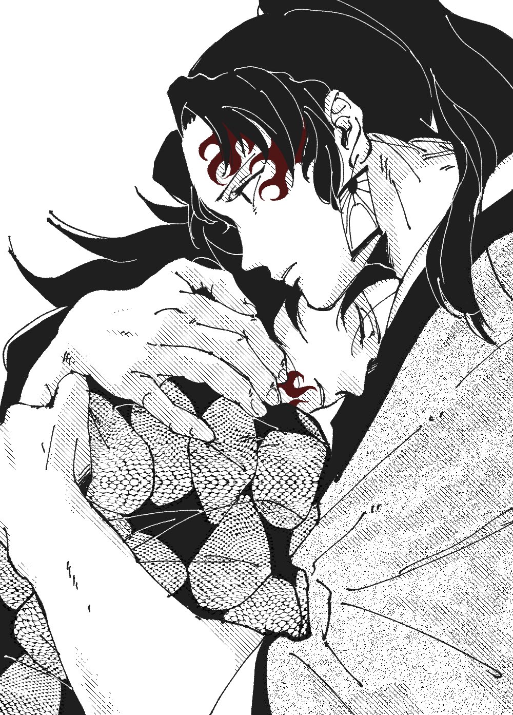 2boysclosed eyesearringsgreyscalehanafuda earringshaorihigh ponytailhugjapanese clothesjewelrykimonolong hairmale focusmonochromemultiple boysns ichibanparted lipsponytailprofilered eyesred tattoosimple backgroundteethupper bodywhite background