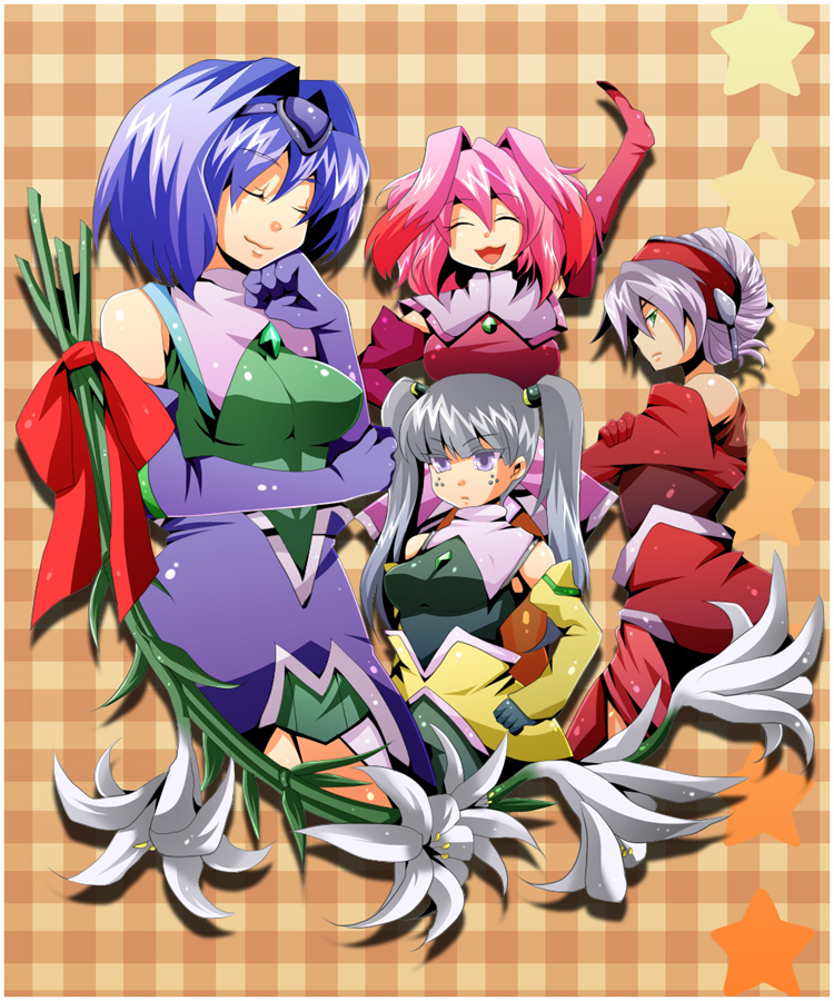 :d1boy4girlsarm upblushcheckered backgroundclosed eyesflowerhairbandjitomemultiple girlsopen mouthpink hairplantpurple hairshort hairsimple backgroundsmilespiked hairstar (symbol)twintails