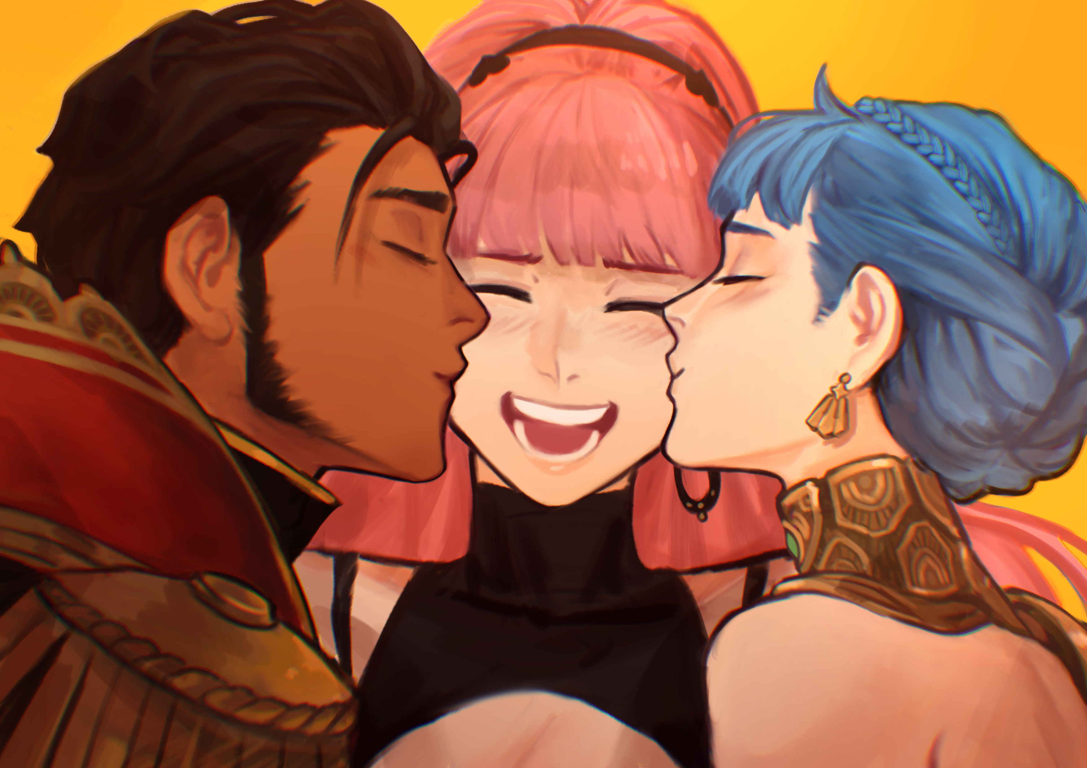 1boy2girlsbisexual femaleblack hairbandblue hairblunt bangsboy and girl sandwichbraidbreastsbrown haircleavagecrown braiddark skindark-skinned maleearringsfacing viewerhairbandhappyjewelrykisskissing cheekmedium breastsmultiple girlsopen mouthpink hairsandwichedshort hairsimple backgroundtongueyellow background