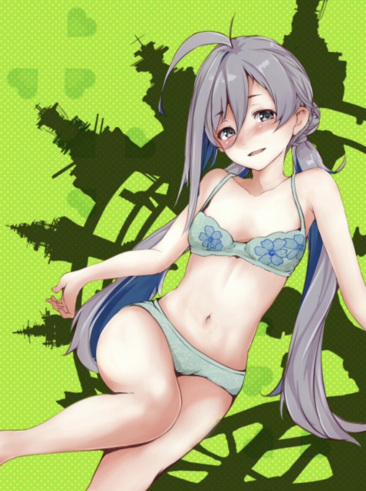 1girlahogebattleshipblushbrabreastsfeet out of framegreen backgroundgreen bragreen pantiesgrey eyesgrey hairhair bunlow twintailsmilitary vehiclenavelnose blushpantiesshipsilhouettesingle hair bunsmall breastssolotwintailsunderwearunderwear onlywarshipwatercraft