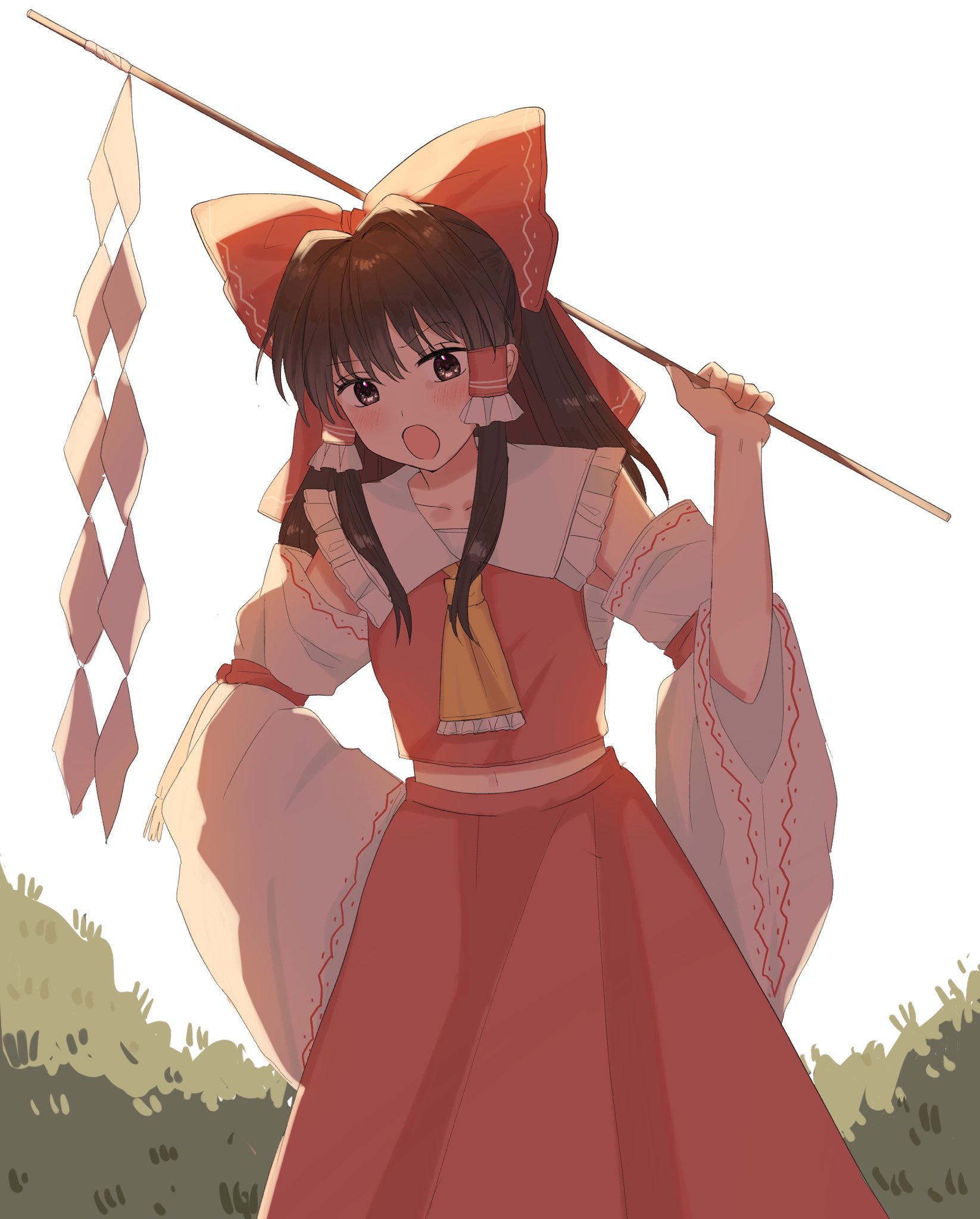 1girlascotbacklightingblushbowbrown eyesbrown haircollarbonedetached sleevesfrilled bowfrilled hair tubesfrillsgoheihair bowhair tubesholdingholding goheilong hairlooking at viewernavelopen mouthred bowred skirtribbon trimskirtskirt setsoloyellow ascot
