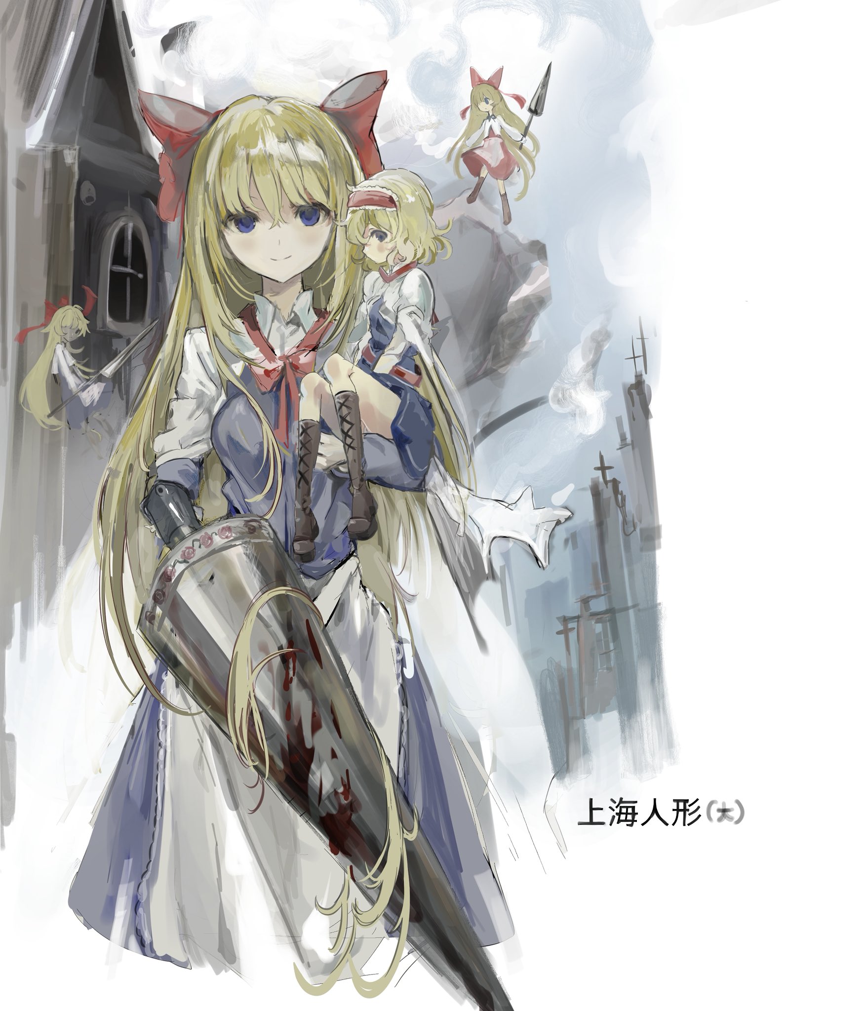 blonde hairbloodbloody weaponblue dressblue eyesbootsbowbrown bootscapeletdolldressholdingholding polearmholding weaponlegslong hairlooking at viewermedium hairpolearmred bowred dressshirtsmilethighsvery long hairweaponwhite capeletwhite shirt