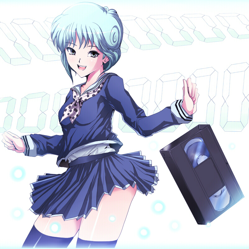 blue hairhappyretro artstyleschool uniformserafukushort hairskirtsmilesolothighhighsvideocassette