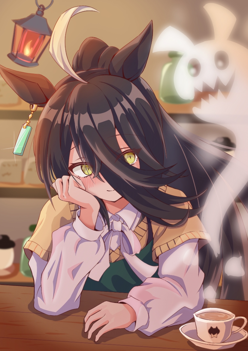 1girlahogeanimal printapronarm on tableblack apronblack hairblushcat printclosed mouthcoffeecollared shirtcupear ornamentear tagearringsfirehair between eyeshand on own facehead resthigh ponytailjewelrylanternlight blushlong hairlong hair between eyeslong sleevesmulticolored hairneck ribbonplateponytailribbonshelfshirtshort sleevesshort-sleeved sweatersingle earringsmilesolosteamsteaming cupsweatervery long hairwhite hairwhite ribbonwhite shirtyellow eyesyellow sweater