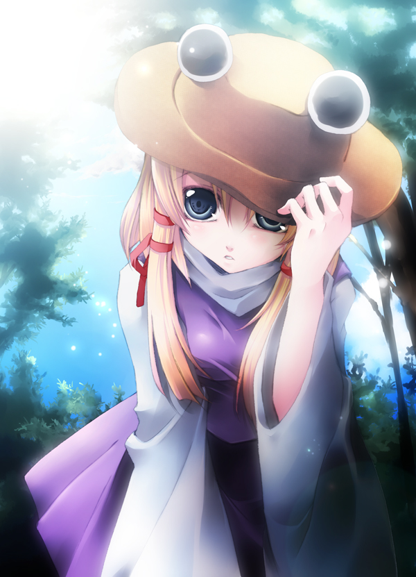 1girlblonde hairblue eyesfemale focushair ribbonhand on headwearhathat over one eyeleaning forwardribbonsolosunlightturtleneckwide sleeves