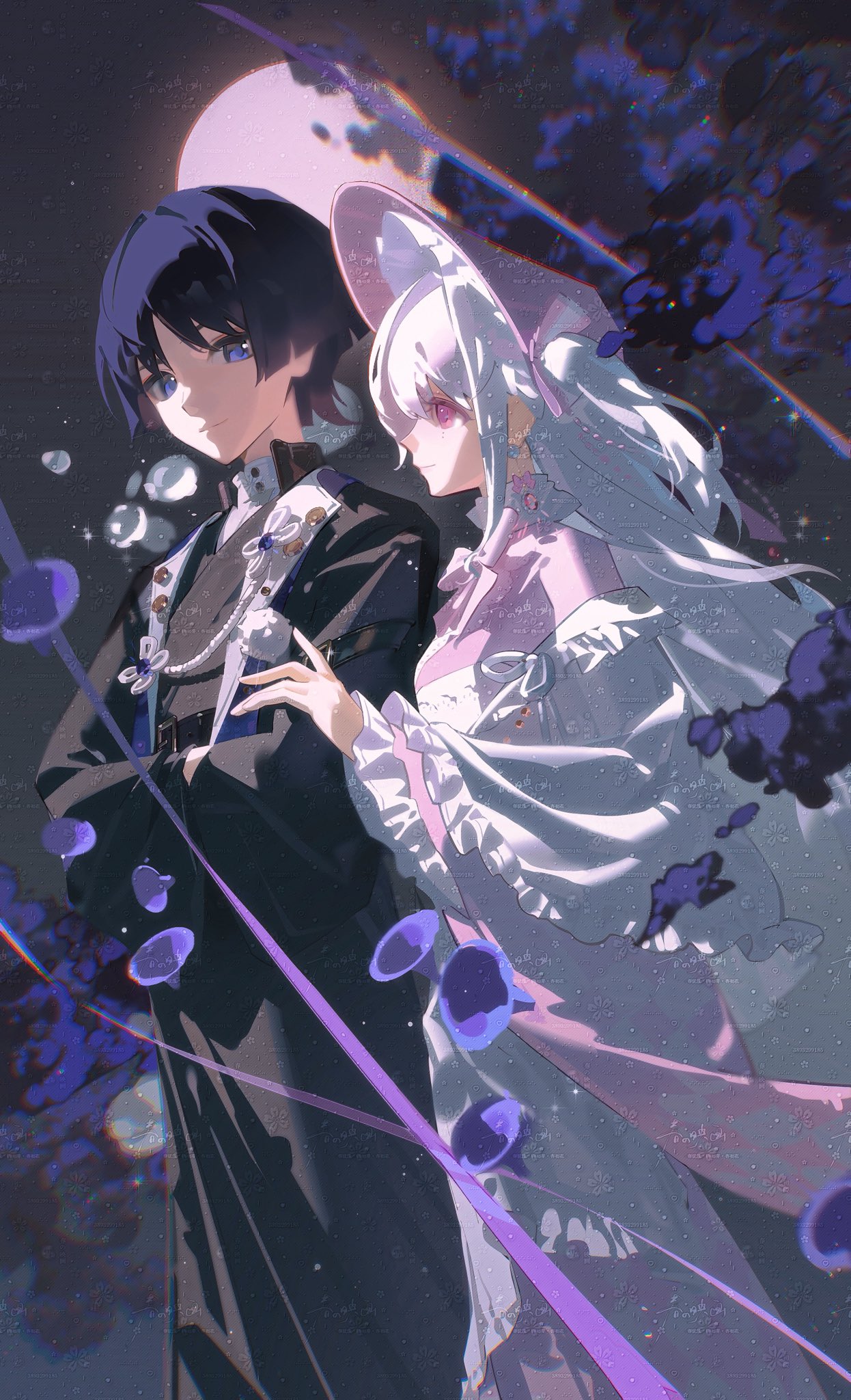 1boy1girlalternate costumearm beltbeltbelt buckleblack beltblack collarblack kimonoblack sleevesblack vestblunt endsbonnetbowbucklechinese knotclear skyclosed mouthcollarcommissioner insertcouplecrossed armsdressearringsfalling petalsfrilled sleevesfrillsfull moonhair bowhair intakeshands in opposite sleeveshathayami momo (hayamimomo)heterohigh collarjapanese clothesjewelrykimonolapelslayered sleeveslong hairlong sleeveslooking at anothermolemole under eyemoonnightnight skyoc x canonone side upopen clothesopen vestoutdoorsparted bangspetalspink bowpink dresspink eyespink hatpink sleevespurple eyespurple hairpurple petalsshirtsidelocksskysmilestandingturtleneckturtleneck shirtundershirtvery long hairvestwhite collarwhite dresswhite hairwhite shirtwhite sleeveswide sleeves