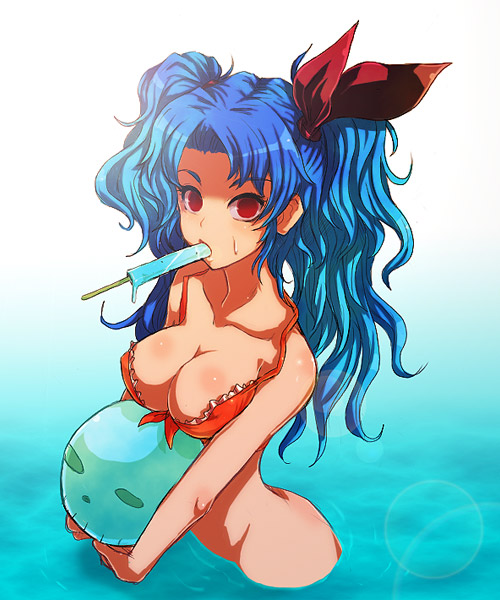 1girlbikinibikini top onlyblue hairbreastscleavagelarge breastsorange bikinipopsiclered eyesribbonswimsuittwintailswater