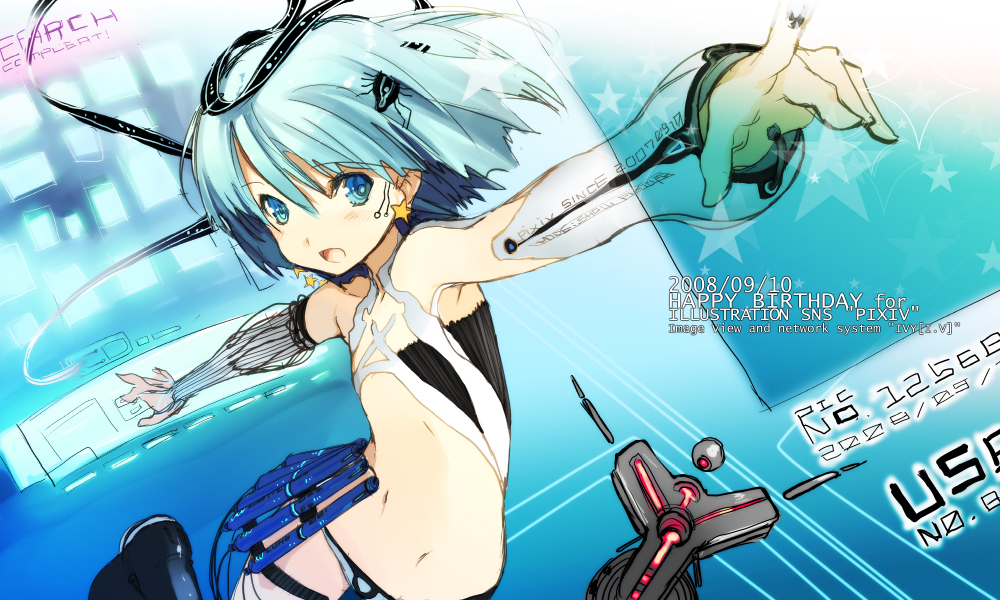 1girlblue eyesblue hairdetached sleevesearringsfemale focusflat chestjewelrymatching hair/eyesshort hairsolo