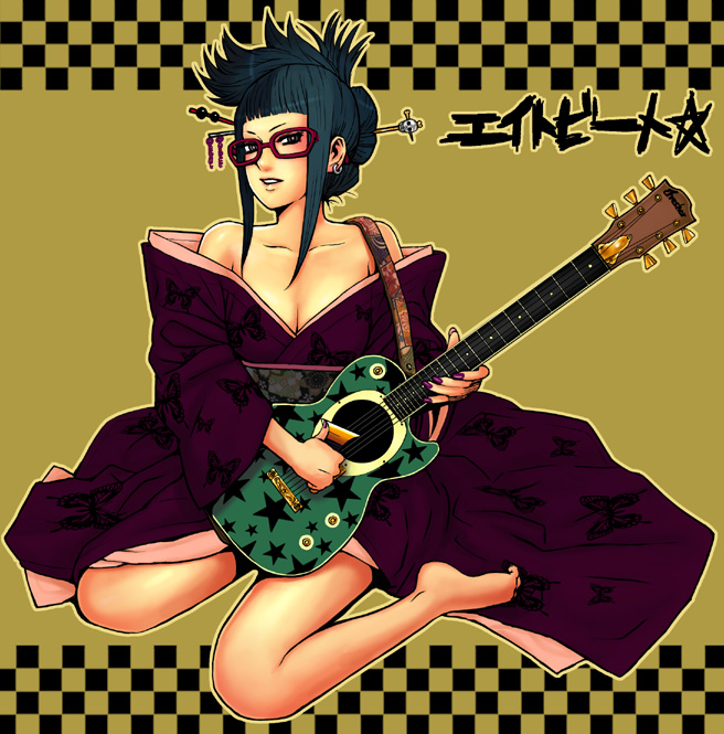 1girlacoustic guitarbare shouldersbarefootblue hairbreastscleavagefemale focusglassesguitarinstrumentjapanese clotheskimonokneelingsolo