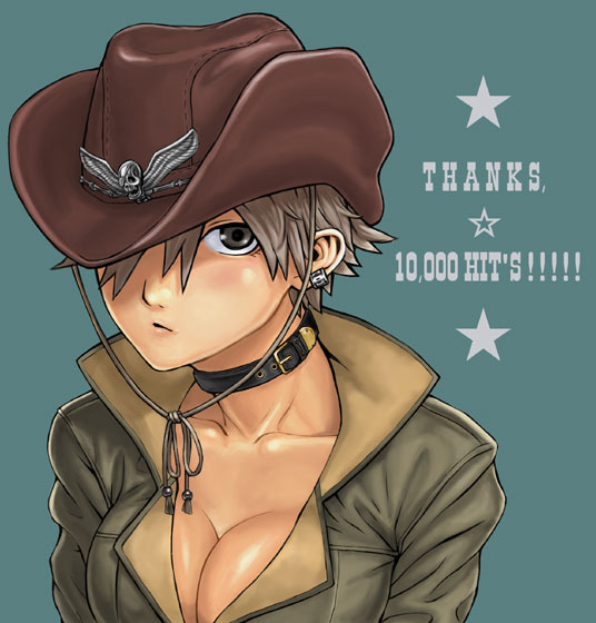 1girlbreastscleavagecollarcowboy hatcowboy westernfemale focushair over one eyehatlarge breastsmilestone celebrationshort hairsolo